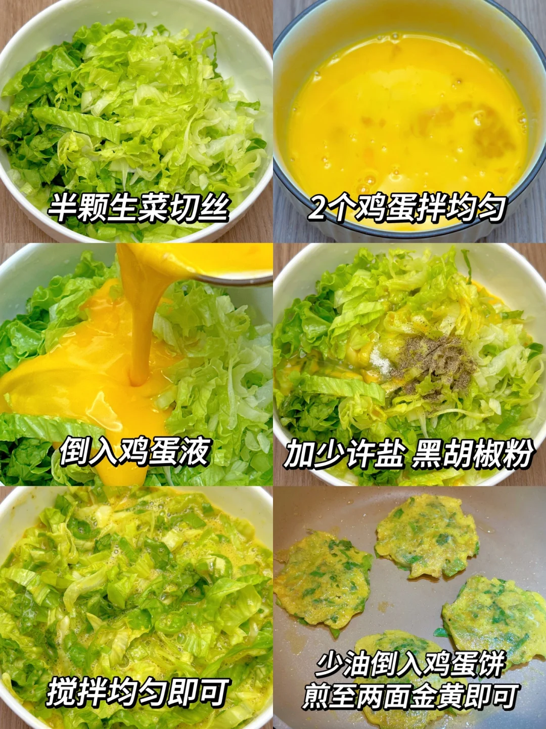 姐妹们,一定要试试这个低卡生菜鸡蛋饼真的泰香了,外焦里嫩,低卡低脂,生菜的清爽再加上浓郁的蛋香味,真的好吃又掉秤,饱腹还强,一大盘两人份也才100多大卡!一个饼才10多大卡,[暗中观察R]减脂期的姐妹们可以放心炫~ [种草R]食材:鸡蛋、生菜(2人份) [种草R]做法:如图所示~ [斜眼R]更多的减脂餐在往期笔记~