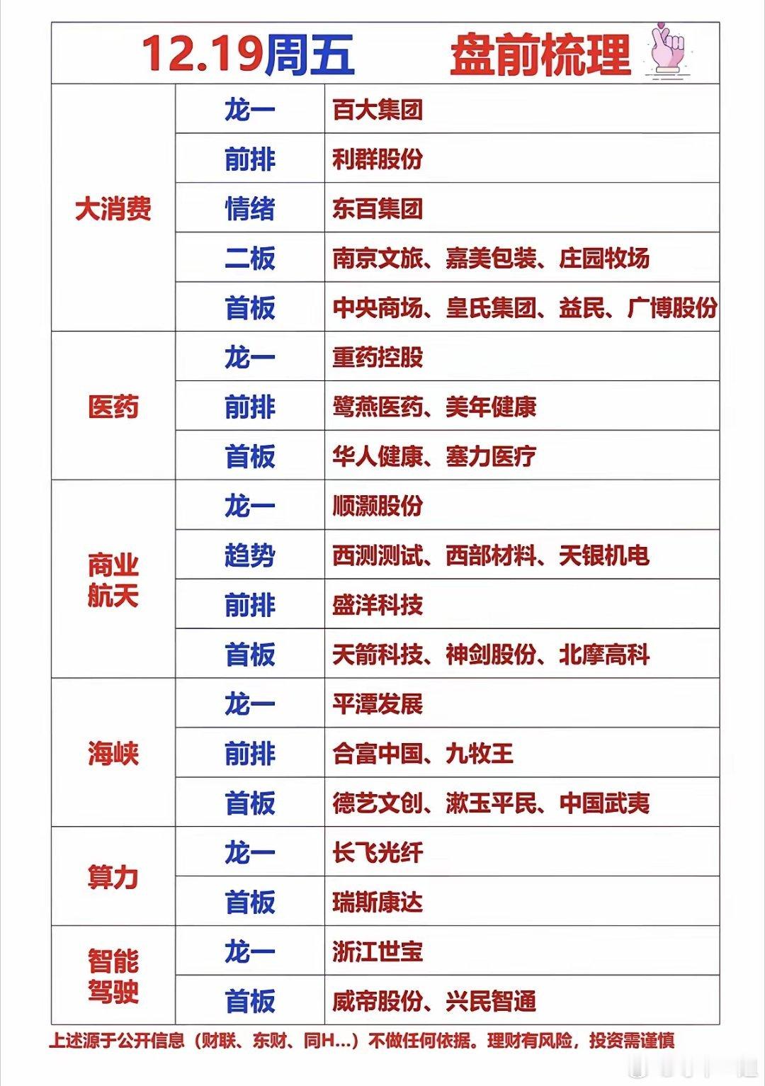 12月19日,周五A股盘前梳理!!!大消费板块:百大集团、永辉超市、东百集团;医药板块:美年健康、华人健康、鹭燕医药;商业航天板块:顺灏股份、西部材料、天银机电;海峡两岸概念:合富中国、平潭发展、九牧王!!