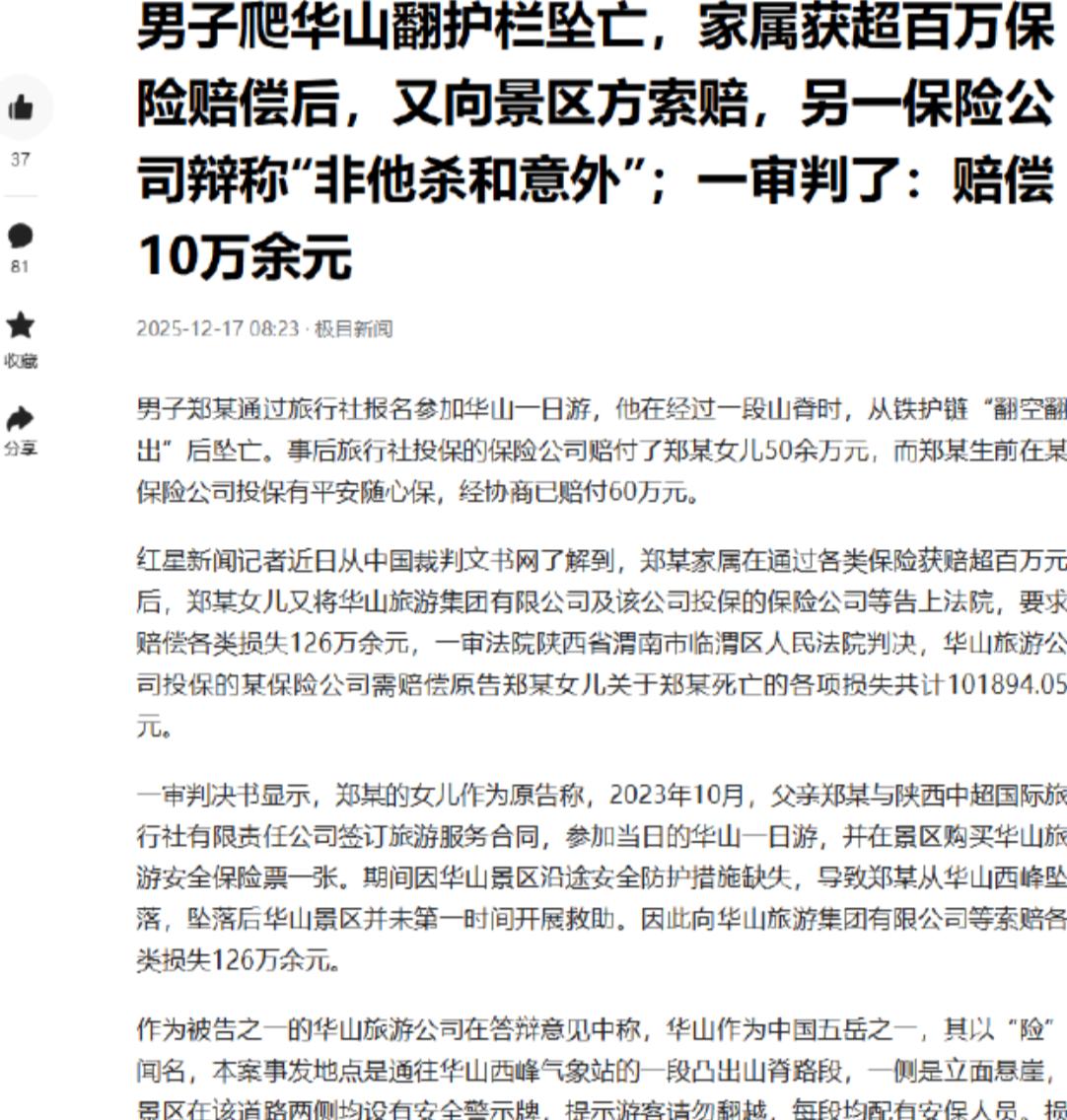 陕西,一男子参加华山一日游,在爬山脊时翻过护栏后坠亡,事后男子女儿获超百万赔偿,却仍不满,又将华山旅游公司和其投保的保险公司告上法院索赔126万,旅游公司称景区有警示牌和安保,已尽义务;保险公司认为男子非意外死亡,都不愿赔。此事法院最终的判决结果令人意外! 事情得从那次看似普通的一日游说起,男子姓郑是个心智成熟的成年人,为了这趟华山之行,他特意报了旅行团,还额外给自己买了一份旅游安全保险,按理说也是做足了准备。 华山的险峻不用多说,尤其是西峰气象站附近的那段山脊,就像一条窄窄的脊背凸在半空,正常人走到这儿都得屏住呼吸,紧紧抓着旁边的铁链,生怕出一点意外。 可监控拍下来的画面,却让所有人都惊掉了下巴,郑某走到那段险峻山脊后,完全没把安全当回事,反而做出了一连串疯狂的举动。他先是莫名其妙地翻过了用来保护游客安全的护栏,整个人趴在护栏外侧那一点点可怜的立足之地,之后更离谱竟然在护栏外连续翻滚了三圈,接着又双脚向下一勾,一系列危险动作之后,悲剧终究还是发生了,他没能稳住身体,直接坠入了万丈深渊。 家里的顶梁柱就这么没了,郑某的家人悲痛万分,不过事故初期,理赔流程走得还算顺利,旅行社投保的保险公司很快赔付了 503800 元,郑某自己买的那份保险也生效了又赔了 60 万,两笔钱加起来超过 110 万,这在人身意外事故里,算是不少的一笔补偿了。 可郑某的女儿却始终过不了心里那道坎,她在整理父亲遗物、复盘整个事件时,注意到了一个细节,父亲坠崖后景区的救助速度似乎不够快,她坚持认为正是景区在黄金救援时间里没有展开有效救助,才彻底切断了父亲生还的最后一丝可能,于是她一纸诉状把华山旅游集团和其投保的保险公司告上了法庭,索赔 126 万余元。 这一下华山旅游公司觉得特别委屈,他们表示那段险峻的山路上,警示牌几乎一步一个,广播里也循环播放着安全须知,安保人员还在不间断巡逻,能做的安全保障都做了。 一个几十岁的成年人,非要无视所有警告和防护,主动翻出去 “玩命”,这怎么能怪景区呢?和景区绑定的保险公司态度也很强硬,意外险赔的是 “意外”,郑某这种主动翻越护栏、做高危动作导致的身亡,根本就是 “自找的”,不在理赔范围内,坚决不愿赔。 双方就这么僵着,这事儿也从单纯的事故赔偿,变成了一场法理上的博弈,按常理说郑某作为成年人,有完全民事行为能力,明知道危险还故意破坏规则,这就是典型的 “自甘风险”,后果本该自己承担,这也是保险公司敢硬气拒赔的原因。 可法院审理案件,不光看事前的行为,还得看事后的作为,郑某女儿抓得最准的一点,就是法律里说的 “安全保障义务”,景区的责任不光是事前装护栏、挂警示牌,还包括事后的救助。 就算游客是自己违规掉下去的,景区作为经营管理者,也得证明自己在第一时间尽了最大努力去救援,要是救助不及时、不专业,那就是没尽到义务,得担责。 而且要说明白的是,之前那 110 多万赔偿,是基于保险合同的意外险理赔,和这次起诉的侵权责任赔偿不是一回事两者互不冲突,不能说拿了意外险赔偿,就不能再追究景区的管理责任了。 法院最后审理下来,就像把责任掰得明明白白,首先肯定了郑某无视警示、主动翻越护栏是导致死亡的直接和主要原因,所以他得自行承担绝大部分责任,但同时也指出,景区在郑某坠亡后的应急处置有短板救助不够及时,属于没完全尽到安全保障义务,这部分次要责任景区不能推脱。 既然景区有责任,那它投保的责任险就得启动,哪怕郑某的行为不算常规 “意外”,但因为景区管理有瑕疵,保险公司也不能全盘推脱。 最后法院给出的判决结果让人意外,既不是像家属要求的那样赔 126 万,也不是景区和保险公司坚持的 “不赔”,而是判决华山旅游集团投保的保险公司,向郑某女儿支付 101894.05 元赔偿款,精准到了分。 这个数字虽然远低于索赔金额,但传递的信号却很明确,游客自己肆意妄为,就得为自己的生命买单,大部分后果得自己扛,可作为开门做生意的公共场所,哪怕面对的是违规的游客,在他生命垂危的时候,要是没拼尽全力去救,那该担的法律责任也躲不掉,这判决不光给华山景区提了醒,也给所有涉险景区的管理者敲了警钟。 (信息来源:极目新闻)