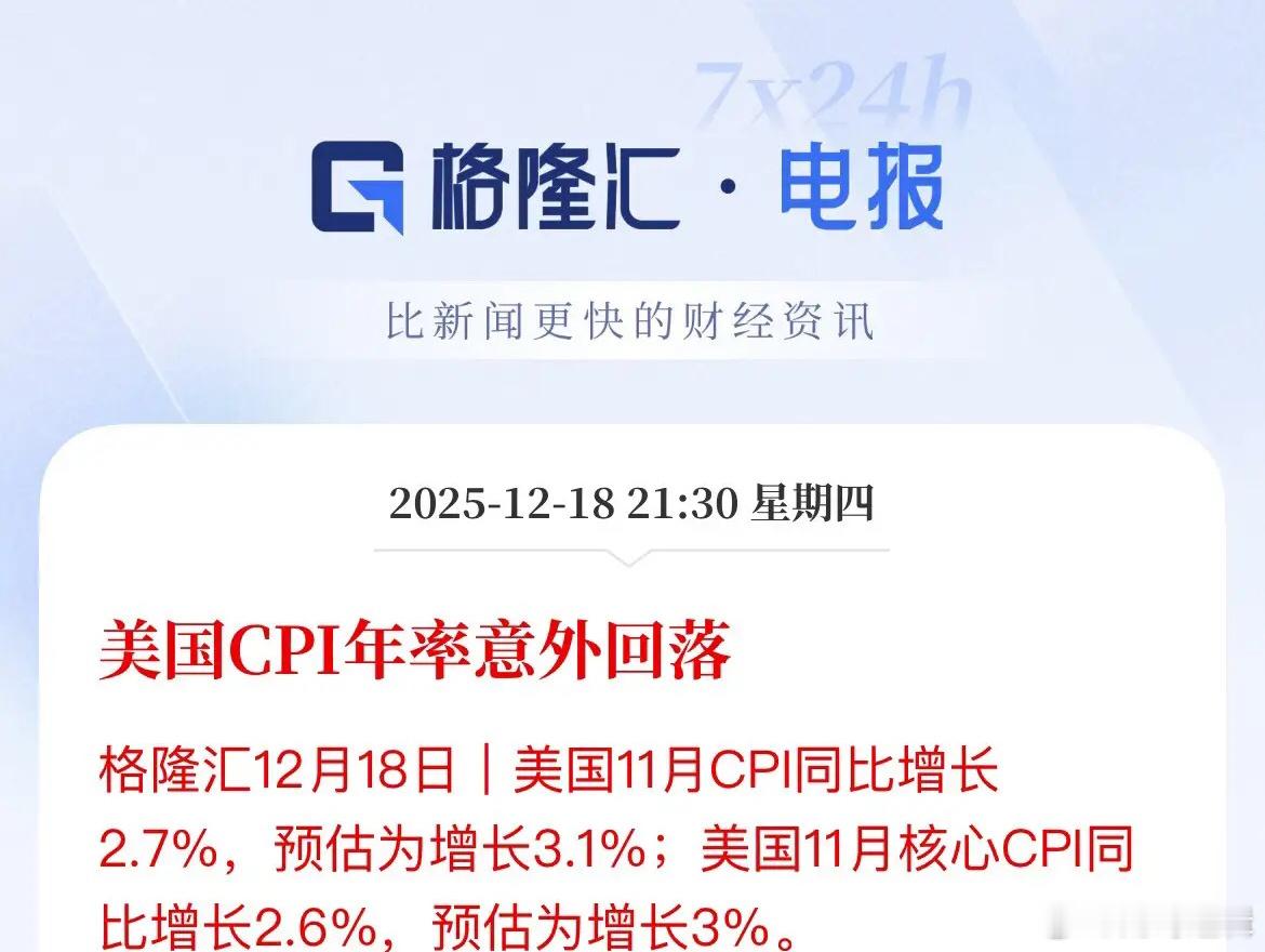 意外回落,低于预期,1月美联储降息还是不降息,美国“停摆”结束之后的首份通胀数据出来,通胀回落,意料之外,回落3%之下市场预估增长3.1%,实际才2.7%,这有点强啊,核心CPI预估3%,实际才2.6%。