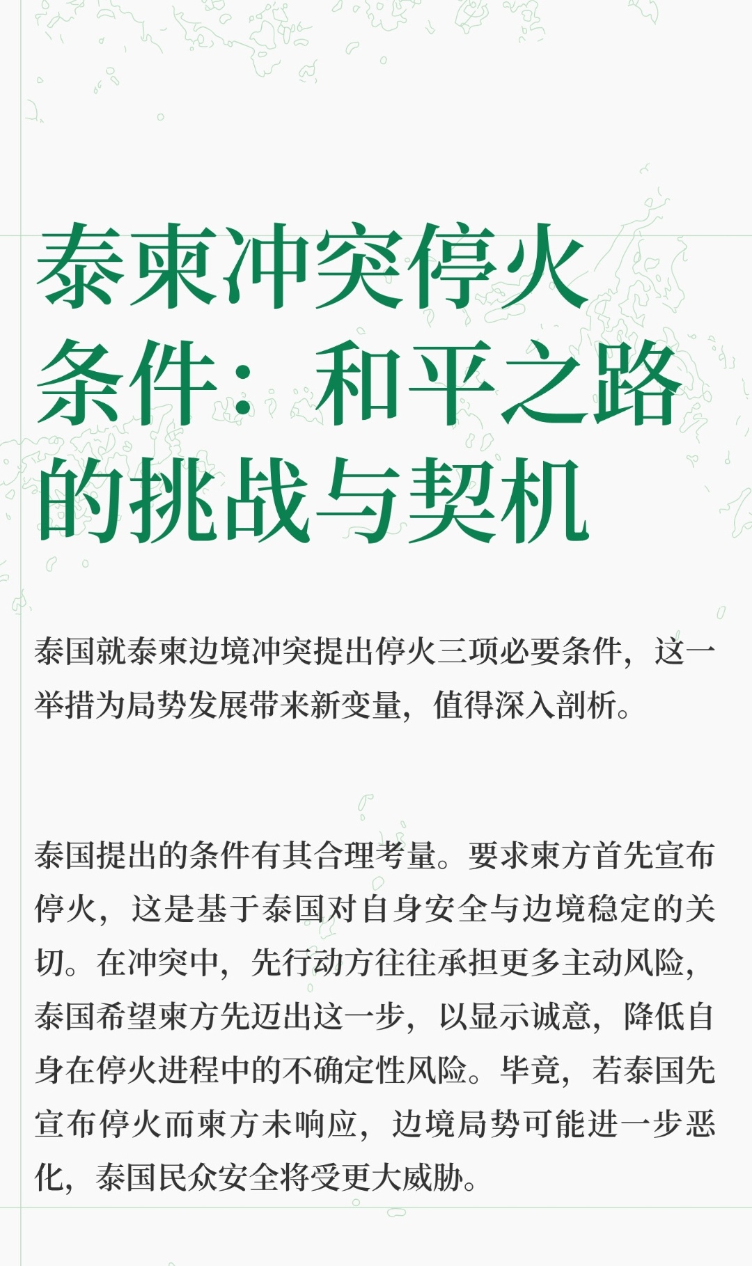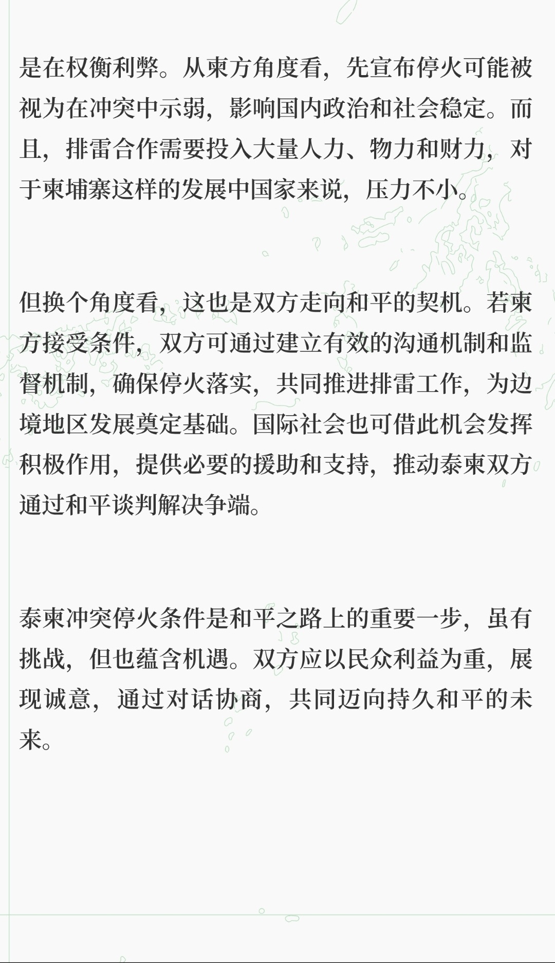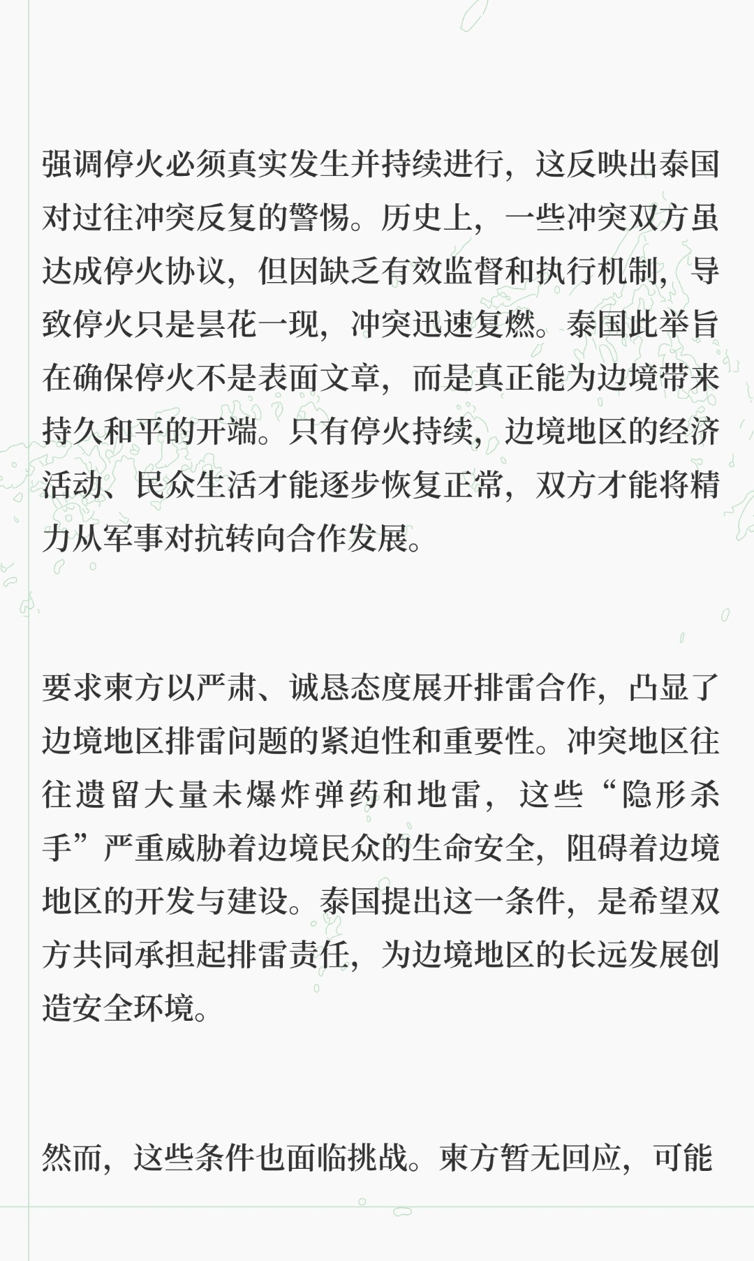 | 泰国就泰柬边境冲突提出停火三项必要条件,这一举措为局势发展带来新变量,值得深入剖析。泰国提出的条件要求柬方首先宣布停火,这是基于泰国对自身安全与边境稳定的关切。在冲突中,先行动方往往承担更多主动风险,泰国希望柬方先迈出这一步,以显示诚意,降低自身在停火进程中的不确定性风险。毕竟,若泰国先宣布停火而柬方未响应,边境局势可能进一步恶化,泰国民众安全将受更大威胁。强调停火必须真实发生并持续进行,这反映出泰国对过往冲突反复的警惕。历史上,一些冲突双方虽达成停火协议,但因缺乏有效监督和执行机制,导致停火只是昙花一现,冲突迅速复燃。泰国此举旨在确保停火不是表面文章,而是真正能为边境带来持久和平的开端。只有停火持续,边境地区的经济活动、民众生活才能逐步恢复正常,双方才能将精力从军事对抗转向合作发展。要求柬方以严肃、诚恳态度展开排雷合作,凸显了边境地区排雷问题的紧迫性和重要性。冲突地区往往遗留大量未爆炸弹药和地雷,这些“隐形杀手”严重威胁着边境民众的生命安全,阻碍着边境地区的开发与建设。泰国提出这一条件,是希望双方共同承担起排雷责任,为边境地区的长远发展创造安全环境。然而,这些条件柬方暂无回应,可能是在权衡利弊。从柬方角度看,先宣布停火可能被视为在冲突中示弱,影响国内政治和社会稳定。而且,排雷合作需要投入大量人力、物力和财力,对于柬埔寨这样的发展中国家来说,压力不小。但换个角度看,这也是双方走向和平的契机。若柬方接受条件,双方可通过建立有效的沟通机制和监督机制,确保停火落实,共同推进排雷工作,为边境地区发展奠定基础。国际社会也可借此机会发挥积极作用,提供必要的援助和支持,推动泰柬双方通过和平谈判解决争端。泰柬冲突停火条件是和平之路上的重要一步,虽有挑战,但也蕴含机遇。双方应以民众利益为重,展现诚意,通过对话协商,共同迈向持久和平的未来。