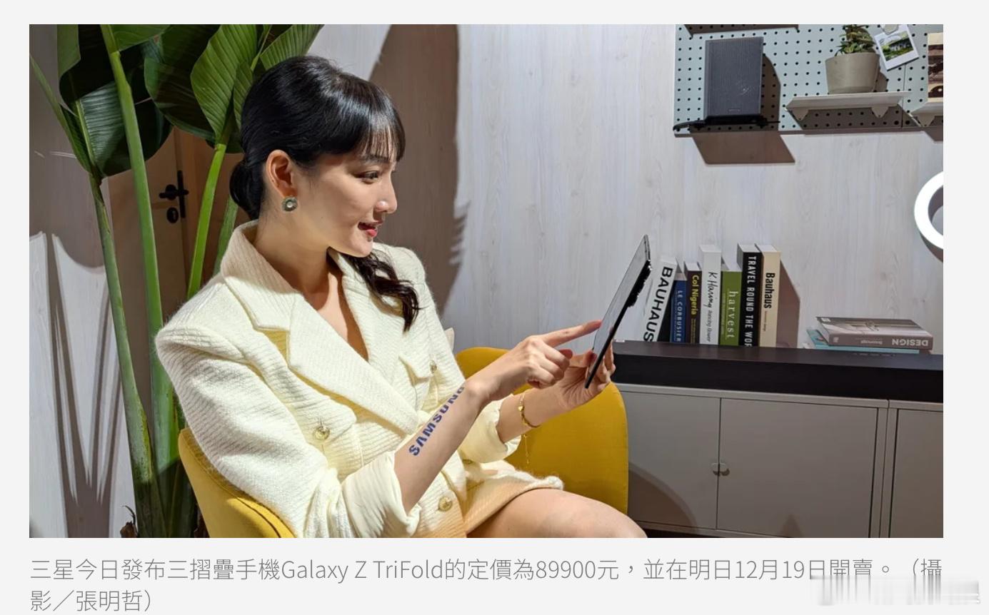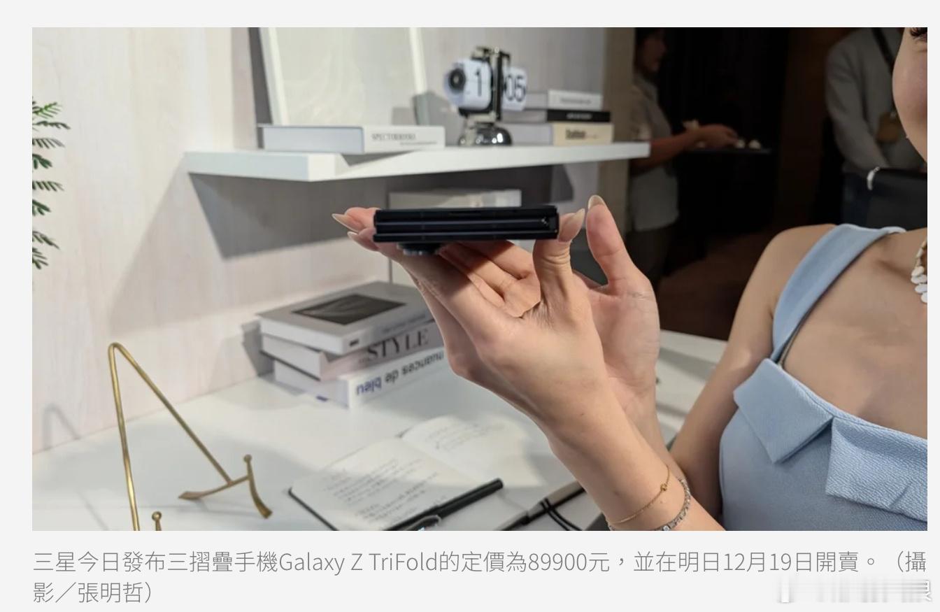 三星Galaxy Z TriFold三摺疊手機登台開賣!定價89900元 外觀、功能、六大尊爵服務一次看三星 (Samsung)首款三摺疊手機 (三摺手機 ,三摺摺疊手機 )Galaxy Z TriFold 正式登台上市,也成為全球唯六首發市場之一!聯合新聞網《科技玩家》實際操作下來驚豔感受到手機薄度,未展開時就像一般手機,展開時就變成10吋平板,摺疊次數也至少可以使用20萬次,展現工藝、效能與創意的極致平衡。三星今日也發布三摺疊手機 Galaxy Z TriFold的定價 為89900元,並在明日12月19日開賣 。最薄僅3.9mm!Galaxy Z TriFold頂級規格 一次看Galaxy Z TriFold的外螢幕為6.5吋,展開後達到10吋。組成外螢幕的三塊面板厚度不一,分別為3.9mm(配備SIM卡槽的螢幕)、4.2 mm(中央螢幕)以及4.0mm(配備側鍵的螢幕)。摺疊時的厚度為12.9 mm。硬體部分Galaxy Z TriFold搭載Snapdragon8 Elite for Galaxy,配有2億畫素相機,5600mAh的三電池模組也是三星摺疊機迄今容量最大的,並支援45W快充,約30分鐘可充飽50%電力。創新設計 專為三摺疊而生Galaxy Z TriFold採用全新升級的Armor FlexHinge轉軸結構,三星也稱是迄今最精良的轉軸,可開闔摺疊使用至少20萬次。兩種不同尺寸轉軸,以雙軌結構運作,即使每片螢幕的重量與組件各不相同,摺疊操作亦維持流暢與穩定,使螢幕面板摺疊後近乎零間隙。Galaxy Z TriFold還配備自動警示功能,如果用戶沒有「以兩邊向內收折」,會發出螢幕提示和震動提醒。展開就變大平板 辦公超方便Galaxy Z TriFold在展開前的尺寸為6.5吋,但展開後的螢幕可以達到10吋,直接化身平板電腦 ,滿足你追劇、辦公的需求。Galaxy Z TriFold還是首款可獨立運作Samsung DeX的手機,意味著用戶可以在Galaxy Z TriFold進行多工處理,最多可建立四個工作區,每一個工作區可同時執行五個應用程式。用戶還可以可透過延伸模式(Extended Mode)外接第二螢幕,享受無縫的雙螢幕體驗。這項功能也可以反過來用,用戶可以將電腦畫面延伸到Galaxy Z TriFold上。定價8萬9900元、12月19日開賣Galaxy Z TriFold為16GB記憶體、512GB儲存空間,定價為8萬9900元,將在明日12月19日開賣。三星也提到,針對Galaxy Z TriFold用戶也有六大尊榮服務,包含一年延長保固、免費專人到府收送、維修期間有專屬備用機Galaxy Z Fold7、到訪服務中心優先受理、購機後一年內有兩次免費螢幕保護貼服務,在三星智慧館或三星商城預約,用戶可享用iOS用戶免費LINE轉機服務。