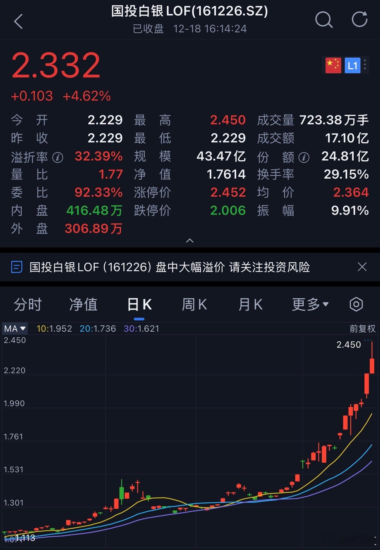 国际银价直线跳水,白银lof 溢折率32%,还有持仓的老板明天赶紧跑。白银