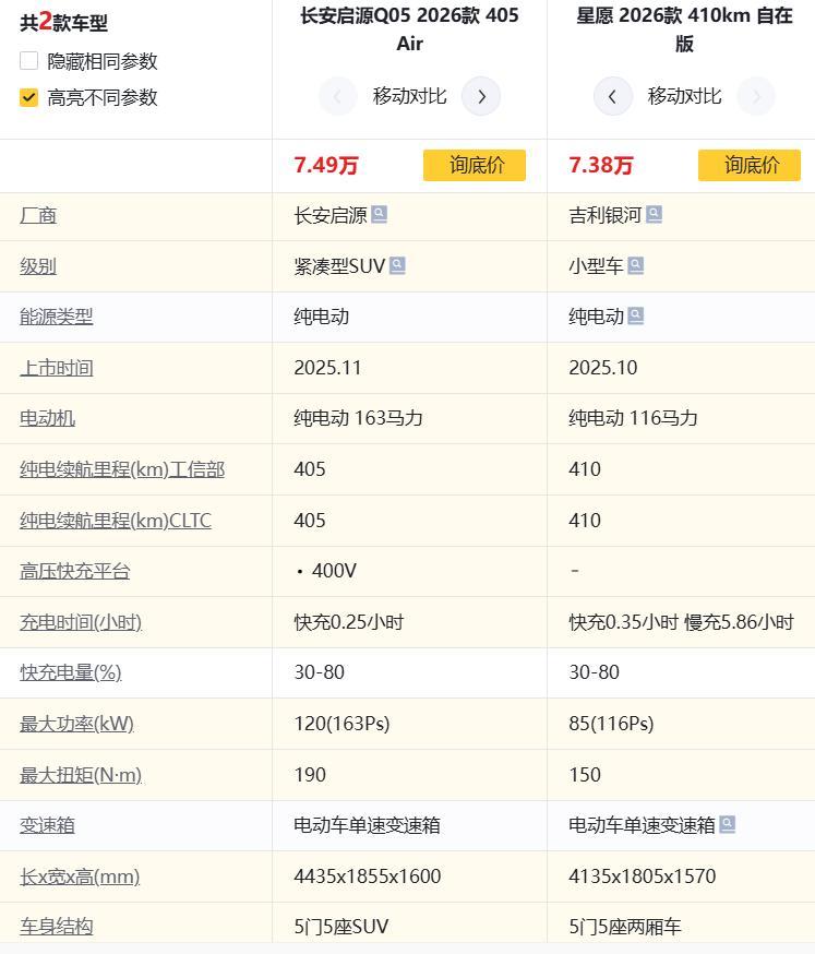 没想到这两款车会有什么交集?启源全新Q05和吉利星愿。 印象中它们不是一个重量级的车型,星愿太小巧了。 原来,它们都属于小型车,姑且叫小型SUV吧,可能不准确。 有人把这两款同价位车型,Q05 405Air版,星愿410km自在版放在一起对比,发现了有意思的现象。两款车的续航基本接近。 Q05车身尺寸大了一大圈,4435和4135的差别,Q05还有400V的快充,星愿快充时间更长……。 如果是你,你会选择可爱,还是选择性价比呢?