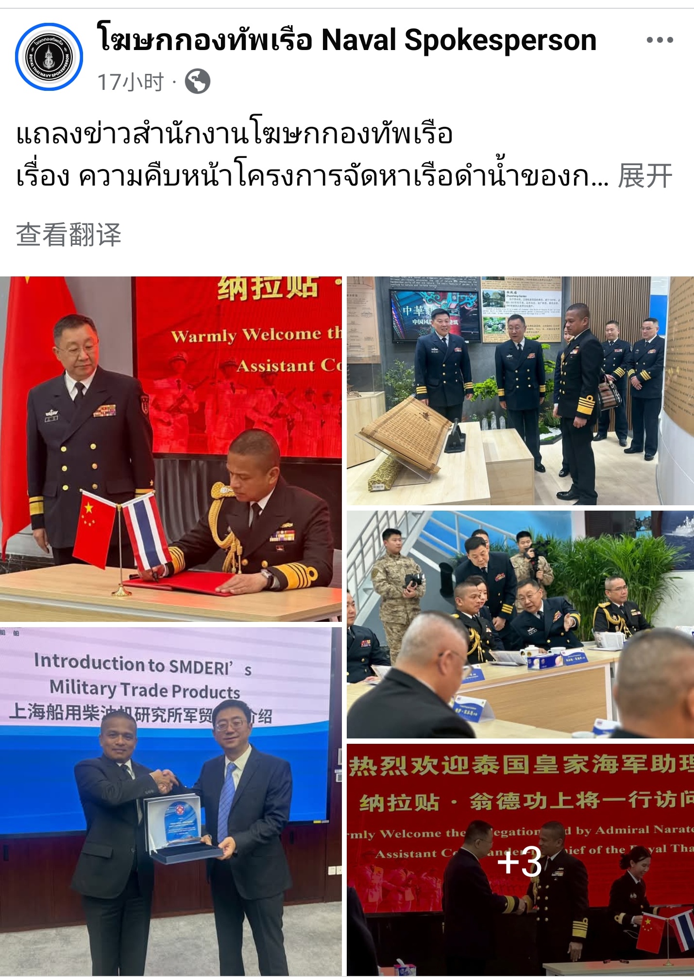 12月9日至19日,泰国皇家海军副总司令兼潜艇采购项目执行委员会主席纳拉贴·翁德功海军上将率领代表团,奉泰国皇家海军总司令派罗·丰占海军上将之命,前往中华人民共和国考察潜艇采购项目的进展情况,并与相关机构探讨军事合作事宜。每天认识一件兵器烽火问鼎计划 代表团访问了位于上海的上海船舶柴油机研究所(SMDERI),该研究所是潜艇和水面舰艇推进系统研发中心。代表团听取了中国船舶集团公司(CSSC)和不依赖空气推进(AIP)研究所代表的技术介绍,了解了各厂商的技术实力。随后,12月12日,代表团前往武汉武昌船舶工业集团有限公司(WSIG)考察S26T潜艇的建造进度。考察期间,代表团确认了潜艇的建造计划和质量控制措施。此外,代表团还从中国船舶贸易有限公司(CSTC)和武昌船舶工业集团有限公司的高级管理人员处了解了项目的进度安排。代表团还参观了武汉海军工程大学,这是一所领先的潜艇人员培养机构。代表团观摩了潜艇逃生训练、水面舰艇损管训练、潜艇模拟训练系统以及各类课程的演示。该大学展示了其能够按照国际标准为泰国皇家海军人员提供培训的能力。泰国皇家海军重申,潜艇采购项目是一项至关重要的国家安全项目,将以审慎、透明和优先考虑国家利益的方式进行。此次进度考察体现了海军致力于按计划推进该项目,以增强国防能力并可持续地维护国家海上利益的决心。