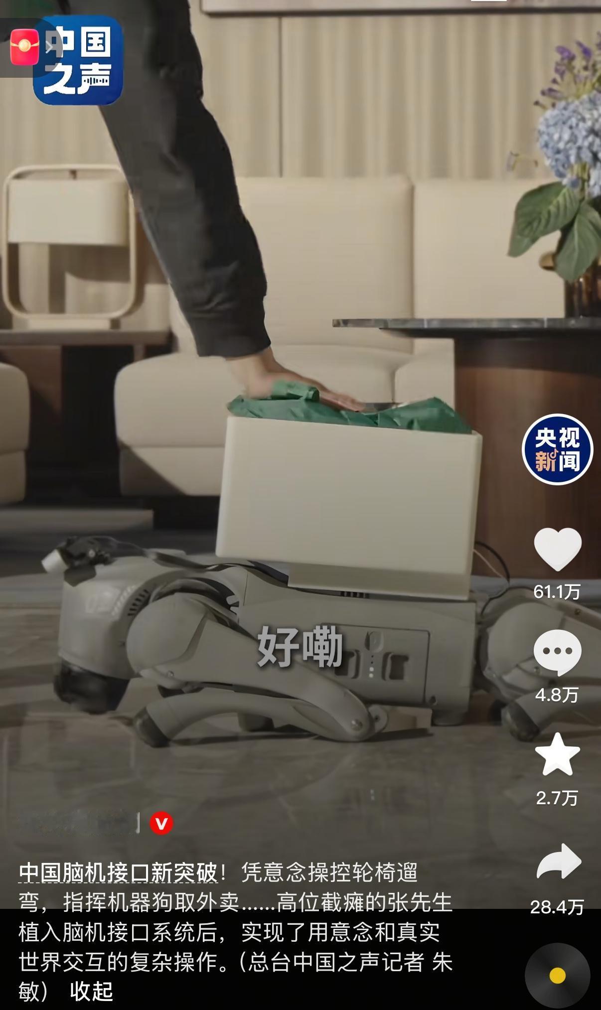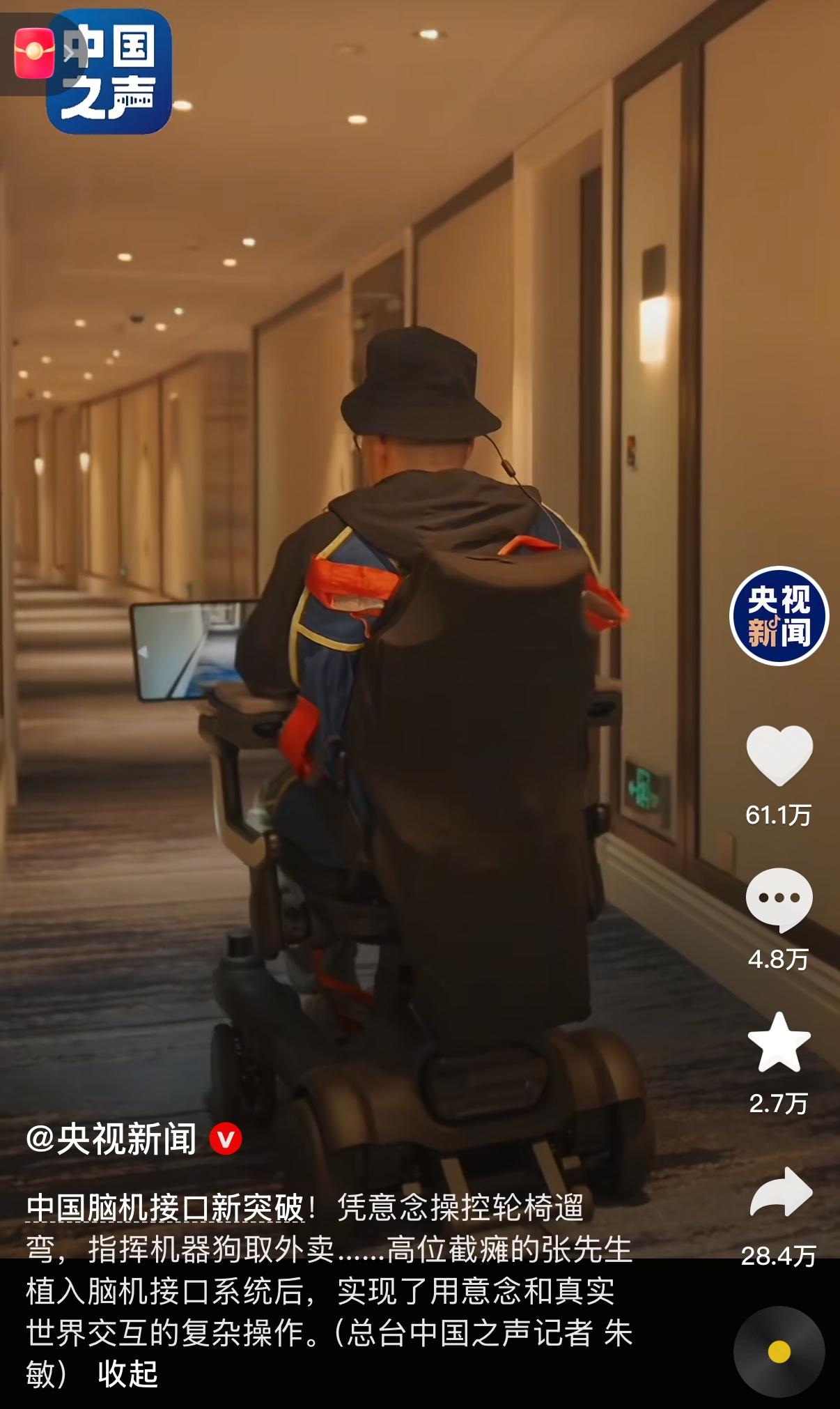 科幻照进现实!中国脑机接口新突破:高位截瘫患者凭“意念”遛弯、取外卖 这真的是太让人震撼了!曾经只在科幻电影里看到的场景,如今在中国科学家的努力下变成了现实。 就在近日,中国科学院脑科学与智能技术卓越创新中心联合复旦大学附属华山医院,发布了侵入式脑机接口临床试验的最新重大突破。 这次的主角是一位高位截瘫的张先生(化名)。2022年因脊髓损伤导致四肢瘫痪的他,在今年6月植入了国产高通量无线侵入式脑机接口系统。 经过训练,张先生现在的生活简直像是开启了“外挂”: * 🚶♂️ 凭意念遛弯: 他可以通过大脑信号直接控制智能电动轮椅,在小区里自如地转弯、前进,享受久违的户外时光。 * 🐕 指挥机器狗: 他能“指挥”机器狗下楼取回外卖或快递,机器狗成了他身体的延伸。 * 💼 实现“再就业”: 更令人感动的是,张先生现在还是一名无人售货机实习分拣员,通过意念控制光标进行商品分拣和数据标注,重新找回了社会价值和生活的信心。 这背后的技术突破非常硬核。研究团队实现了从二维屏幕控制到三维物理世界交互的跨越。 * 超低延迟: 系统端到端延迟被压缩到了 100毫秒以内,这甚至低于人体自然神经传导的生理延迟(约200毫秒)。这意味着张先生的“意念”和设备的动作几乎是同步的,真正做到了“心想事成”。 * 超强抗干扰: 即便在嘈杂的真实生活环境中,系统也能通过先进的算法提取有效信号,而且具备“在线重校准”功能,越用越顺手,不需要频繁停下来手动调整。 目前,该团队已经完成了三例临床试验。随着WRS02升级版系统的推出,未来脑机接口将能实现更精细的操作,比如弹钢琴、甚至修复视觉和听觉。 科技的终极目的,是给人以希望。这项技术不仅连接了大脑和机器,更连接起了那些被疾病阻隔的美好生活。为中国的科研团队点赞!🇨🇳