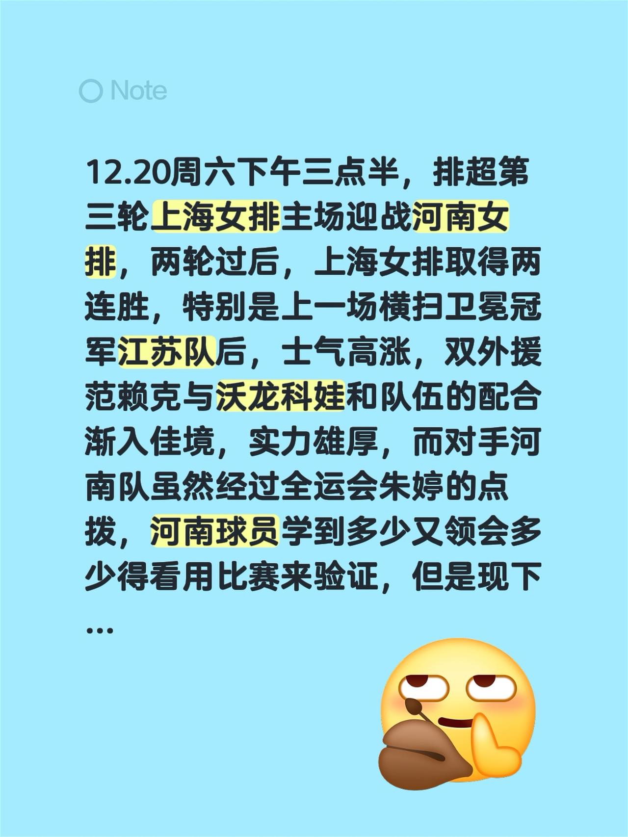 12.20周六下午三点半,排超第三轮上海女排主场迎战河南女排,两轮过后,上海女排取得两连胜,特别是上一场横扫卫冕冠军江苏队后,士气高涨,双外援范赖克与沃龙科娃和队伍的配合渐入佳境,实力雄厚,而对手河南队虽然经过全运会朱婷的点拨,河南球员学到多少又领会多少得看用比赛来验证,但是现下拿下上海女排一局都很难吧!