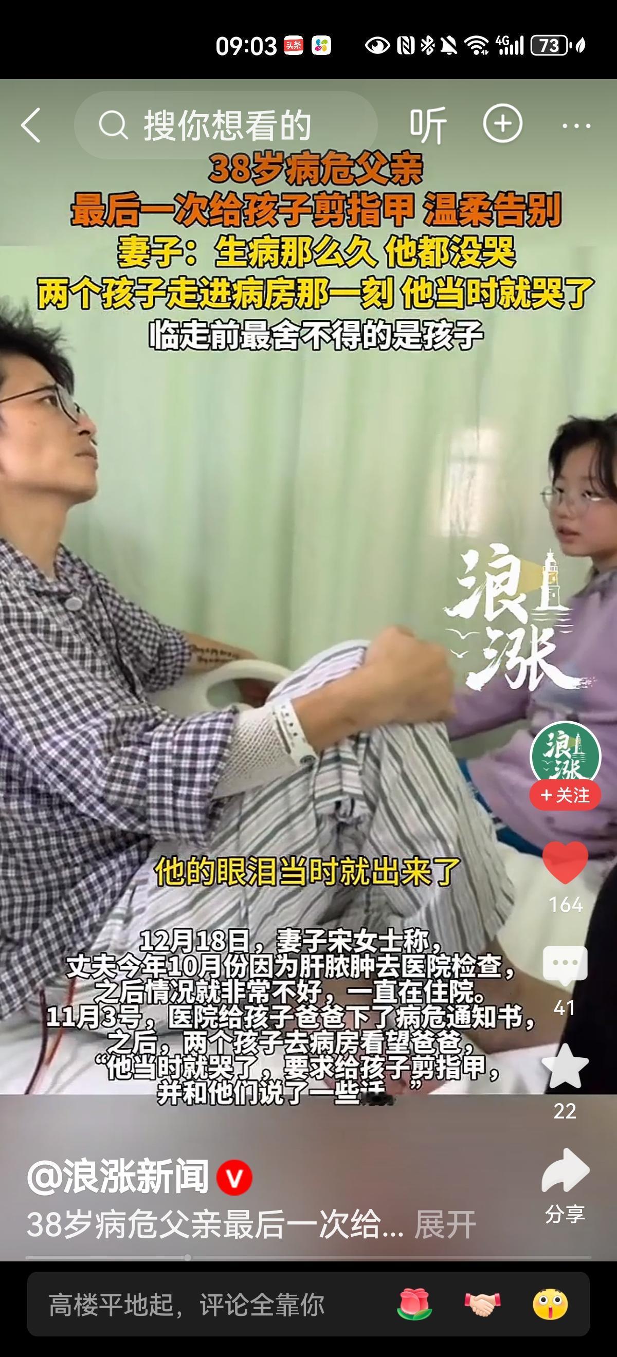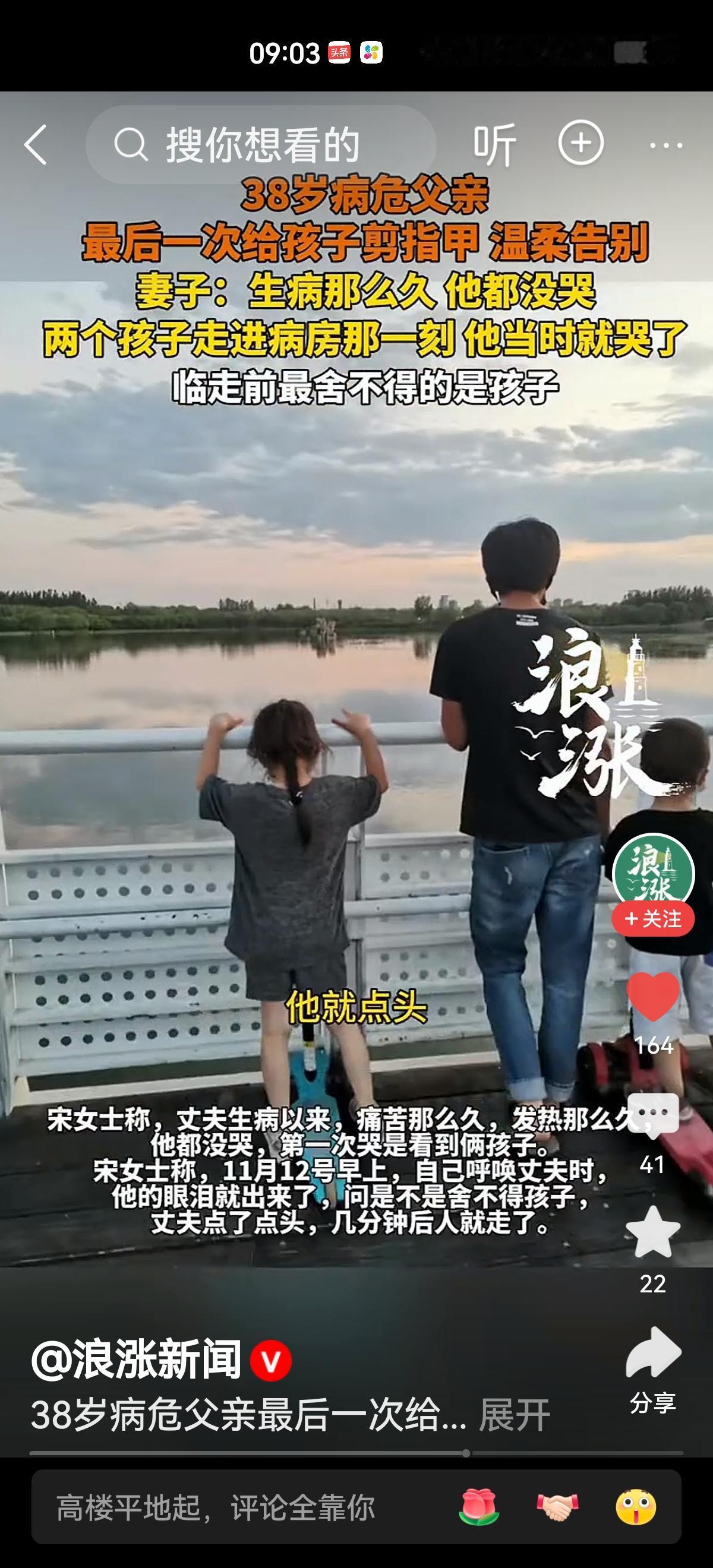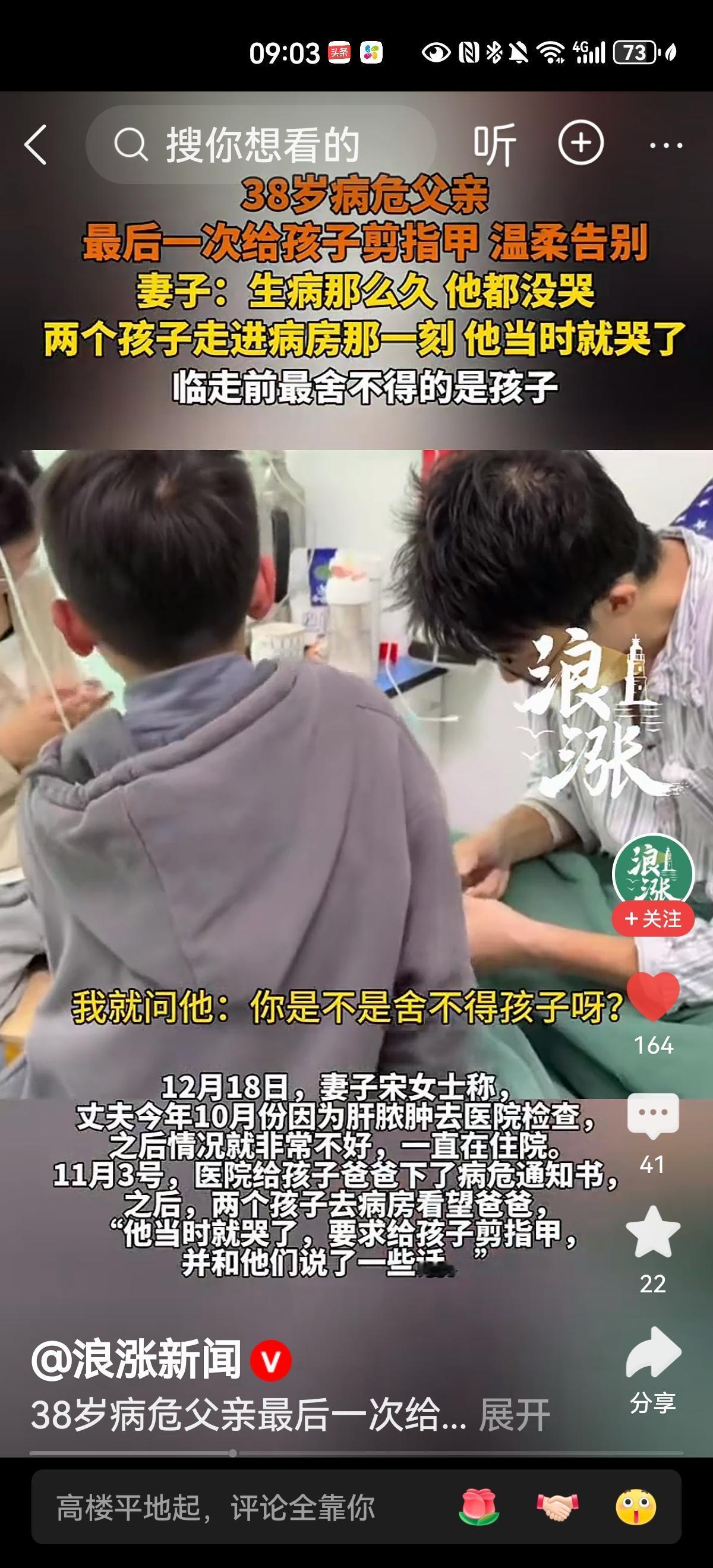 生离死别是人生之痛! 河北一位38岁的父亲,在被下病危通知书后,最后一次给孩子剪指甲的一幕感动了无数人。 在生命的最后时刻,最难以割舍的是亲情。所以每个人都应该懂得珍惜,学会珍惜。这世间本没有放不下的恩恩怨怨,唯有亲情才是最心中最柔软的部分。 珍惜当下,过好每一天,这才是人生最大的收获。生老病死是人生的常态,我们无法把握,但能够把握的就是呵护你所爱的人,让自己快乐,让你所爱的人快乐。能够做到这一点,人生也就无憾了!