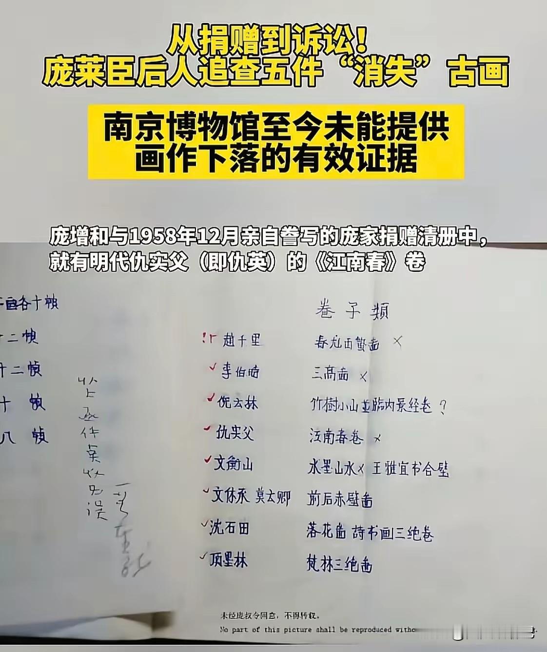 爱心人士捐赠的五幅孤本名画, 在南京博物馆不翼而飞, 这里面一定有猫腻, 虽然时间跨度六十多年, 经历了几任院长, 但不能人死账空, 这也属于盗窃贪污罪, 不查个明明白白, 不知会寒了多少人的爱心。南京国家文物 失窃文物 文物案件 名画失窃
