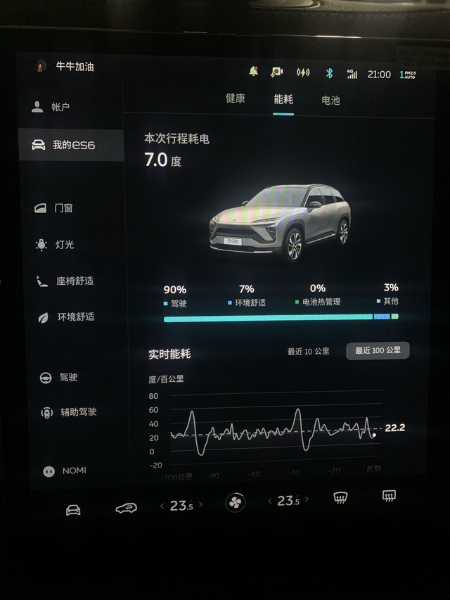 晚上八点多气温零下3度 空调和座椅加热打开。北京五环上车不是很多,车速在100到120之间,因为是高速路段,这段行程的平均能耗到了23.6千瓦时每百公里。但是最近100公里的平均能耗是22.2千瓦。北方的冬天到了,电车能耗要变得高些了。