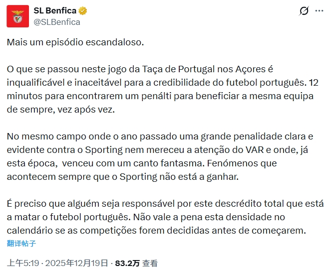 直播吧12月19日讯针对葡杯第5轮葡体3-2逆转圣克拉拉比赛中出现的争议判罚,本菲卡官方发文进行批判。