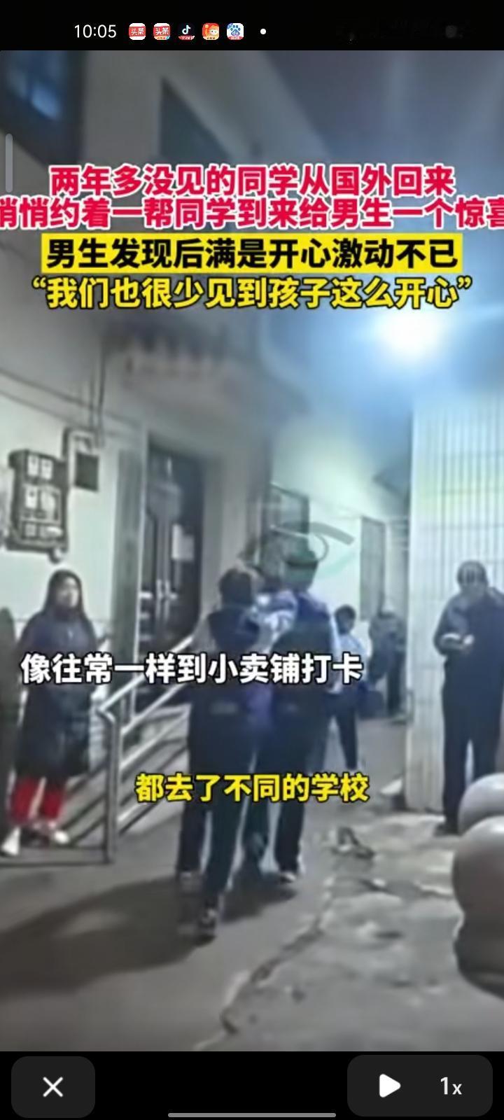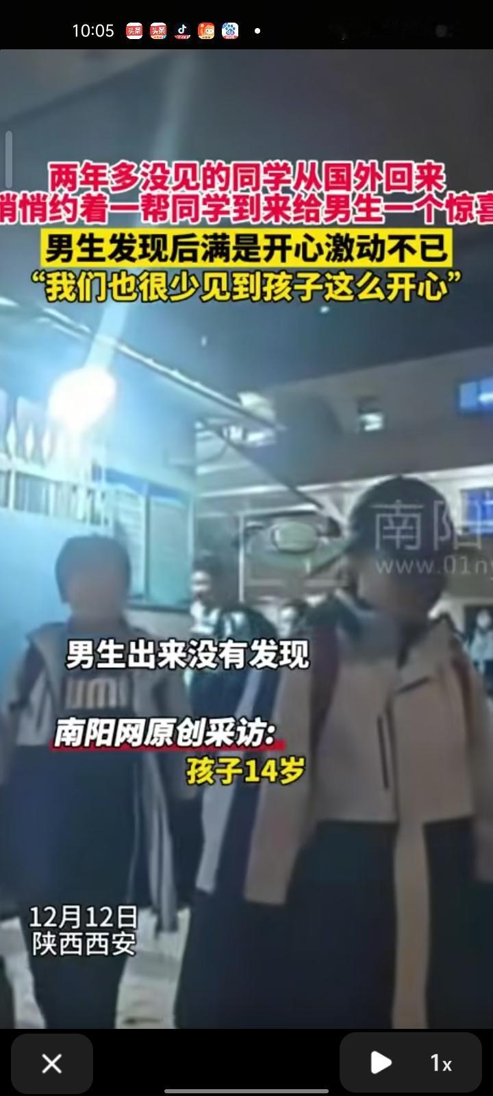 12月12日,陕西西安。孩子爸爸发布一段视频,两年多未见的同学从国外回来,约着同学悄悄来到儿子就读的学校准备给他一个惊喜,和平时一样跑去门口的小卖铺打卡,儿子发现后满是开心惊动不已。 孩子爸爸表示,视频中这几位的都是小学同学,关系特别要好,上了中学他们都去了不同的学校,有的还出国了。初三生活压力比较大,很少见到孩子这么开心了,所以就把这一时刻记录下来了。
