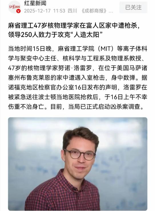 美国的核聚变首席科学家被枪杀了! 当地时间15日晚,麻省理工学院的核聚变首席科学家惨遭枪杀。这位本该在实验室为人类能源未来攻坚的物理学家,最终却倒在了冰冷的枪口下,而他带领着两百多人的顶尖团队全力攻克的,正是被称为“人造太阳”的核聚变技术——一项足以改写人类能源格局的颠覆性技术。 核聚变技术的意义有多重大? 简单来说,一旦成功落地,人类将获得几乎无限且廉价的能源。其核心燃料氘取自海水,每30升海水提取的氘聚变释放的能量就相当于1吨汽油,全球海水蕴含的氘能量,是当前全球化石能源总储量的数百万倍,完全能摆脱对传统能源的依赖。 更关键的是,这也是当下中美竞争最激烈的科技赛道之一,中国在该领域已实现多次技术突破,合肥东方超环、成都环流三号等装置不断刷新世界纪录,合肥BEST装置更是瞄准2027年建成目标,离商业化发电越来越近。在这样的关键节点,美国顶尖核聚变团队的核心人物遇刺,难免让人浮想联翩。 深究背后的利益纠葛,答案或许藏在“谁会因核聚变成功而受损”里。 这项技术一旦落地,最先被冲击的就是两大利益群体: 一边是深耕百年的老派化石能源巨头,石油、煤炭、天然气等产业将面临被彻底颠覆的风险; 另一边则是如今风头正劲的新派新能源领域,像光伏发电、风能、太阳能等,在近乎无限廉价的核聚变能源面前,性价比和竞争力都将大打折扣,甚至可能沦为“淘汰品”。 更耐人寻味的是,就在这位科学家遇刺前不久,被不少人称为“马圣”的马斯克刚公开表态,称核聚变是“圈套”,还直言试图在地球上造“微型版太阳”是极其愚蠢的。 要知道,马斯克正是美国新能源领域的核心玩家,旗下布局了大量光伏发电相关产业。一旦核聚变技术成功商业化,他苦心经营的光伏帝国无疑将面临巨大冲击,甚至可能大幅贬值。 没想到话音刚落,主导美国核聚变攻坚的核心科学家就遭遇横祸,这时间上的巧合,实在让人无法不多想。 目前美国警方已将此案列为凶杀案正式侦办,但结合美国过往的类似案件,不少人已经开始预判后续走向——毕竟美国曾发生过警察自杀后精心布置成他杀现场的案例,更有不少争议案件最终被轻飘飘定性。难怪有网友直言:“估计最后调查结果又是‘后背开八枪自杀’的荒唐结论。” 说到底,这位科学家的悲剧,本质上就是“挡了别人的财路”。 核聚变技术承载的是全人类的能源未来,却动了既得利益集团的奶酪。 当科学探索触碰了庞大的利益蛋糕,连顶尖科学家的人身安全都无法保障,这不仅是美国科研界的损失,更让人看清资本裹挟下的残酷现实。 在资本与利益的博弈中,推动人类进步的科学探索,还能拥有一片安全的土壤吗?