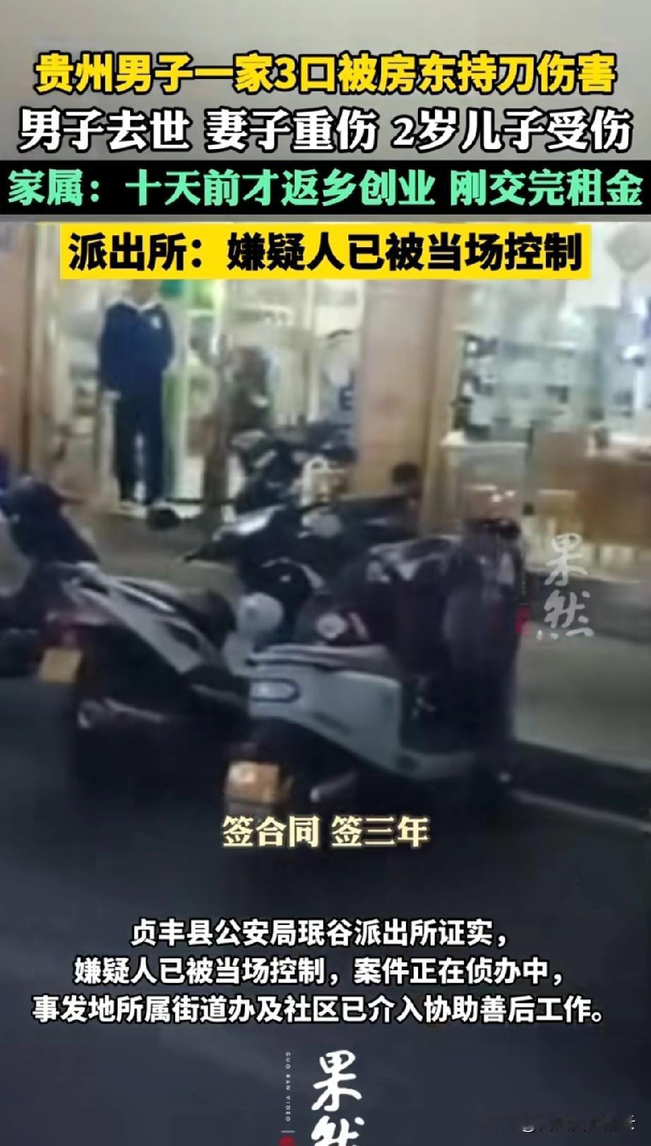 这件事真是太恶劣了。贵州,从浙江义乌回家创业的小两口,带着两岁的儿子。本来都找好了房子,合同也签了,他们租了三年的房子,把钱也一次性给了房东。 不知什么原因,房东突然恼羞成怒,拿刀不仅捅死了男主人,还把他的妻子捅成重伤,两岁的孩子他也没放过,也有受伤。 这个人真是歹毒,连孩子都不放过。说起双方的矛盾,有知情人说是因为房东想加价1000元,房客不同意,两人发生争吵,房东恼羞成怒。 也有当地人说,因为房东嫌房客装修声太大,吵到他了。 不管什么原因,既然签了合同,人家房客也交钱了。这份协议就算生效了,有什么事不能坐下来好好协商解决吗?为什么非要暴力解决?房东你毁灭别人家庭的同时,也毁了自己的人生。 对于这件事,你怎么看呢?