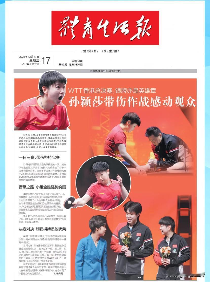 孙颖莎“带伤上阵”上头条了!理解万岁! 体育生活报:银牌也是英雄章,孙颖莎带伤上阵感动观众! 文章详细描述了孙颖莎一日三赛,小组突围,混双决赛虽然没有夺得冠军,但虽败犹荣。 终于有媒体,体谅一下莎莎了。 莎莎不需需要过多的褒奖,只需要将它的实情告诉大家。 理解万岁!