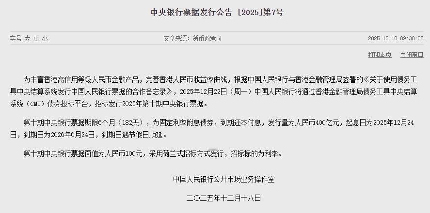 据中国人民银行12月18日消息,为丰富香港高信用等级人民币金融产品,完善香港人民币收益率曲线,根据中国人民银行与香港金融管理局签署的《关于使用债务工具中央结算系统发行中国人民银行票据的合作备忘录》,2025年12月22日(周一)中国人民银行将通过香港金融管理局债务工具中央结算系统(CMU)债券投标平台,招标发行2025年第十期中央银行票据。(环球时报)