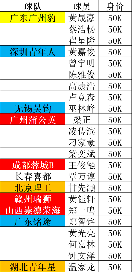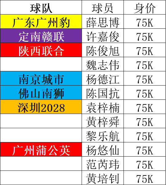朱老师已经把职业联赛体系内的球员身价更新完了,虽然身价只是一个参考值,不过其实从身价定义上可以看出一些端倪,除了老将身价自动下跌外,100K基本就是中超球员门槛,中甲则是75K,中乙则是50K,以上是指可以踢首发,以下为这个标准下部分广东球员身价(非中超球员50K以下的不列)