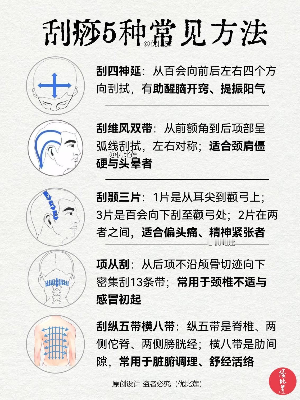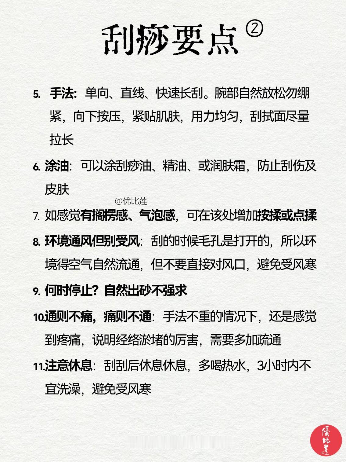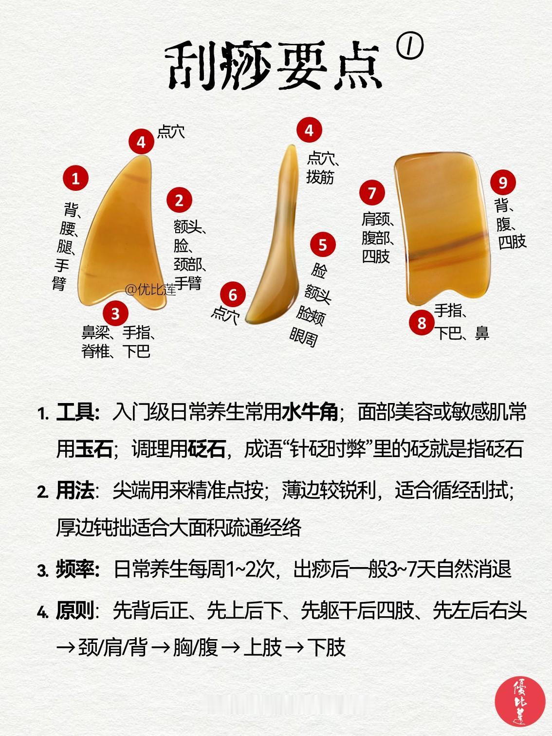刮痧保姆级攻略【收藏版】,从工具到禁忌,看完这篇全懂了! 识别痧: 鲜红色:有内热 小点:健康 紫红色:体表有寒 紫色:体内有寒 紫黑色:体内有寒+血瘀 黑色:寒气严重 片状:有寒湿淤积 砂包:寒湿较重,易生病 大片状:寒湿严重 刮痧5种常见方法 1、刮四神延:从百会向前后左右四个方向刮拭,有助醒脑开窍、提升阳气 2、刮维风双带:从前额角到后项部呈弧线刮拭,左右对称;适合颈肩僵硬与头晕者 3、刮颞三片:1片是从耳尖到颧弓上;3片是百会向下刮至颧弓处;2片在两者之间,缓解偏头痛、精神紧张 4、项从刮:从后项部沿颅骨切迹向下密集刮13条带;常用于颈椎不适与感冒初起 5、刮纵五带横八带:纵五带是脊椎、两侧佗脊、两侧膀胱经;横八带是肋间隙,常用于脏腑调理、舒经活络 刮痧要点: 1、工具:入门级日常保健常用水牛角;面部美容或敏感肌常用玉石;调理用砭石,成语“针砭时弊”里的砭就是指砭石 2、用法:尖端用来精准点按;薄边较锐利,适合循经刮拭;厚边钝拙适合大面积疏通经络 3、频率:日常养生每周1~2次,出痧后一般3~7天自然消退 4、原则:先背后正、先上后下、先躯干后四肢、先左后右头 → 颈/肩/背 → 胸/腹 → 上肢 → 下肢 5、手法:单向、直线、快速长刮。腕部自然放松勿绷紧,向下按压,紧贴肌肤,用力均匀,刮拭面尽量拉长 6、涂油:可以涂刮痧油、精油、或润肤霜,防止刮伤及皮肤 7、如感觉有搁楞感、气泡感,可在该处增加按揉或点揉 8、环境通风但别受风:刮的时候毛孔是打开的,所以环境得空气自然流通,但不要直接对风口,避免受风寒 9、何时停止?自然出砂不强求 10、通则不痛,痛则不通:手法不重的情况下,还是感觉到疼痛,说明经络淤堵的厉害,需要多加疏通 11、注意休息:刮刮后休息休息,多喝热水,3小时内不宜洗澡,避免受风寒 人体经络就像城市里的道路,哪里淤堵了都会造成交通堵塞,也易发交通事故~ 宜及时疏通经络,避免气血运行不畅~ 刮痧