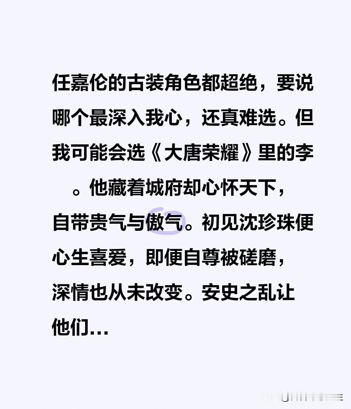 任嘉伦的古装角色都超绝,要说哪个最深入我心,还真难选。但我可能会选《大唐荣耀》里的李俶。 他藏着城府却心怀天下,自带贵气与傲气。初见沈珍珠便心生喜爱,即便自尊被磋磨,深情也从未改变。安史之乱让他们分分合合,可他对沈珍珠的心始终如一。最后沈珍珠时日无多离开,他装作不知,扮车夫送她最后一程,那一幕太戳人。任嘉伦把李俶的深情、无奈与痛苦诠释得淋漓尽致,让人看一次就心疼一次,这个角色真的在我心里扎根了。 任嘉伦 任嘉伦演技 明星 [赞][赞][赞]