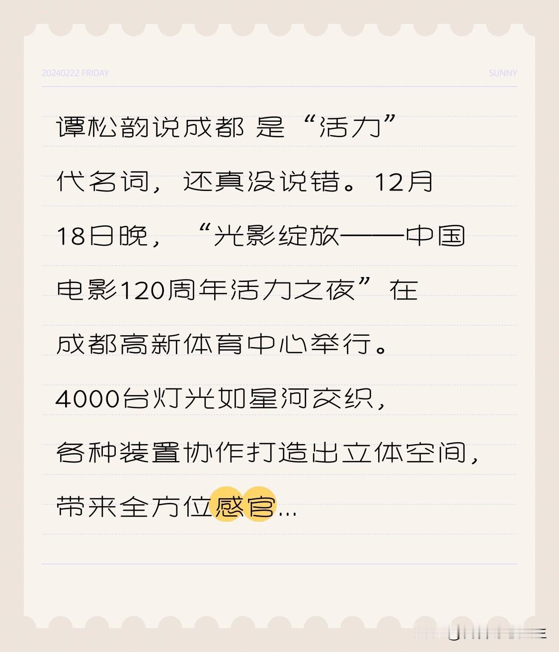 谭松韵说成都 是“活力”代名词,还真没说错。12月18日晚,“光影绽放——中国电影120周年活力之夜”在成都高新体育中心举行。4000台灯光如星河交织,各种装置协作打造出立体空间,带来全方位感官盛宴。 活动以音乐为脉络,通过四大篇章串联起银幕记忆。众多知名电影人如姚晨、谢娜等齐聚,歌星周深、李宇春等现场演唱经典电影歌曲。其实成都与电影缘分已久,1904年就有了首场“活动电戏”,1985年百花奖颁奖典礼还曾落户这里。成都这活力,在电影领域体现得淋漓尽致! 和人交往,你看重的是人品还是金钱 如何看待孙俪一件羽绒服穿15年 明星 [赞][赞][赞]