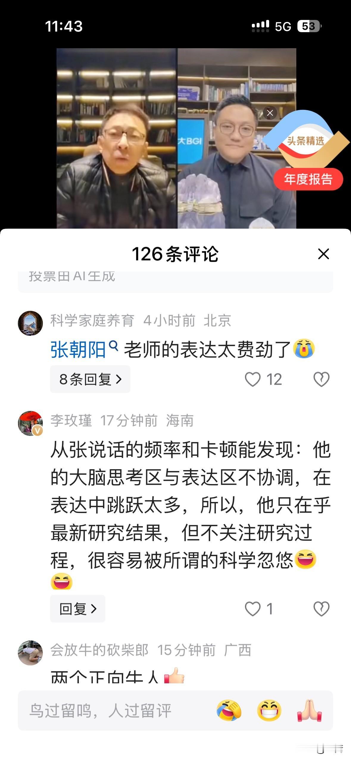 很费劲地听完张朝阳和尹烨的对话,就是围绕大脑可以再生重塑的话题。张朝阳说自己前几年不开心,也就是抑郁,但他用行为心理学的原理重新生成了一个新的自己。 哎,听完后就感觉,你们用的那些概念啊、名词啊,理论啊,整那么多真的不累吗? 大白话就是,人老了就有一种毛病:喜欢安慰自己的身体机能还能继续保持活力,因此会到处寻找论据来支持自己能永葆青春的妄想。