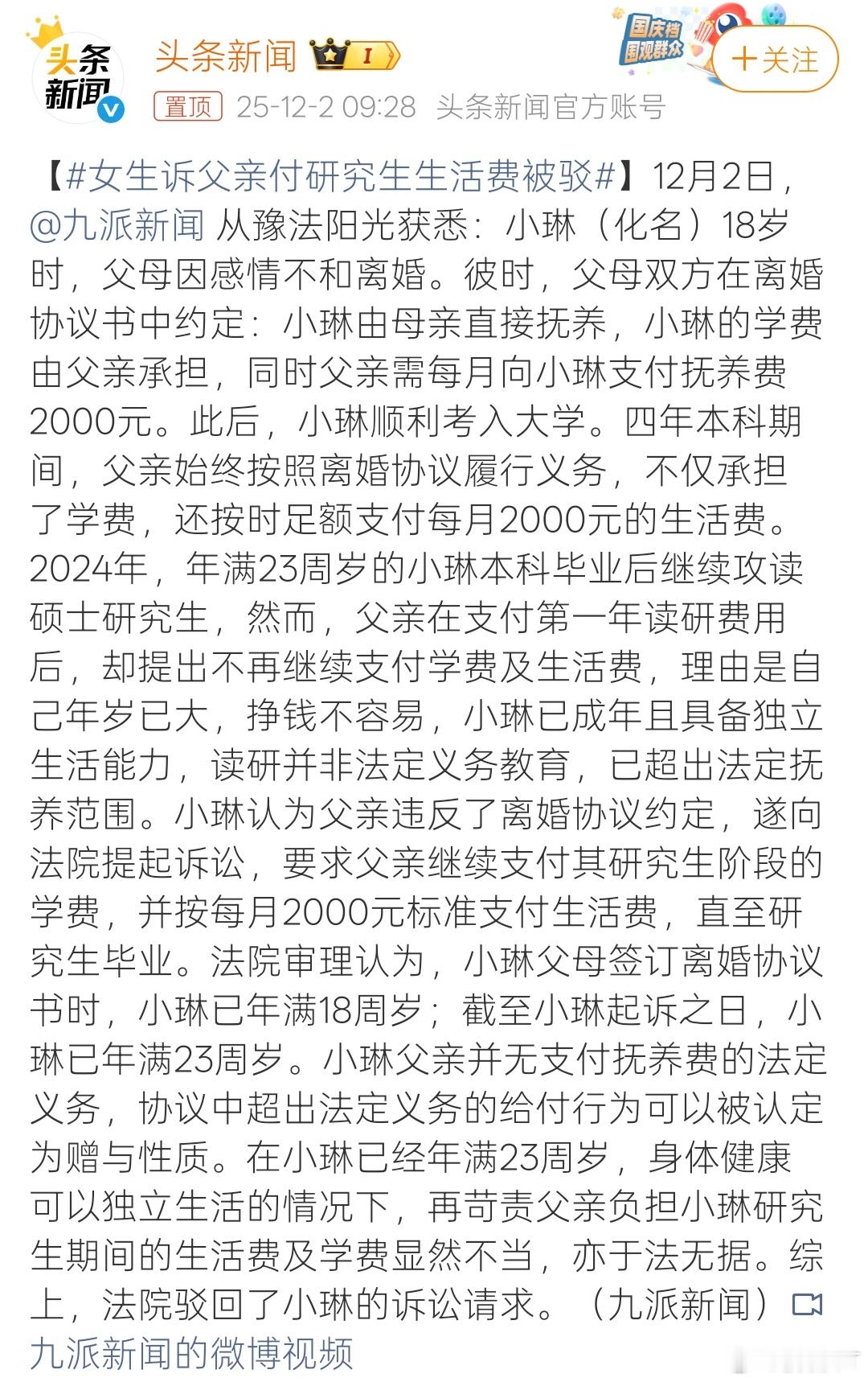 以为是没开二度,没想到居然是新的案子。而且不比之前,这次法官选择支持原告。法院判决,由生父承担2025-2026年学年学费的一半,大学期间每年给予4000元学费,每月1000元的学费等。学费太贵生父无力承担被女儿起诉