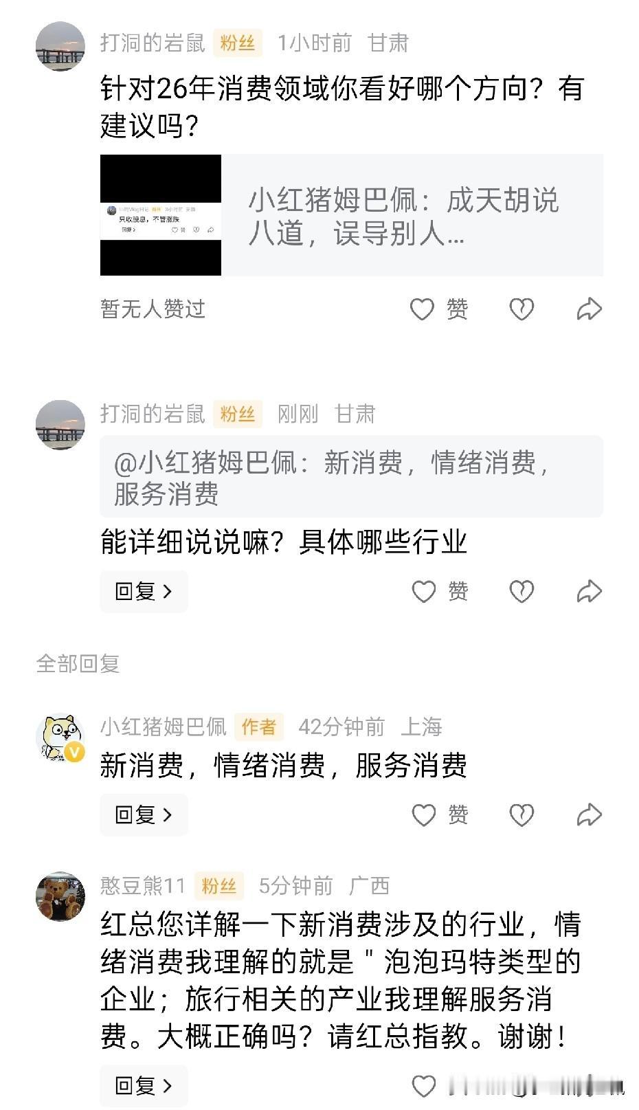 回答粉丝朋友关于消费业投资的提问: 消费不是我目前重点看的行业,相关标的我目前也就比较关注泡泡玛特,那天我专门写过一篇文章,可以去看一下。必选消费要等CPI转正后才考虑介入,情绪消费和新消费,我认为目前泡泡玛特都属于标杆龙头。 服务消费包括了旅游(新增长点可能在户外,冰雪,相应带来户外的服装,滑雪的服装以及相关景点的需求)、传媒(游戏为主)等,因为消费行业目前没有重点关注,所以重点标的在服务消费领域我一个也没有仔细看,也不能冒昧说。 大体除了泡泡玛特外,还有布鲁可,晨光股份(IP),恺英网络(游戏),中宠股份(宠物),探路者(户外),长白山(冰雪)。这些企业报表我都没深入看过,只对大家感兴趣领域指引一些方向,有兴趣你们可以自己去研究一下 @打洞的岩鼠 @憨豆熊11