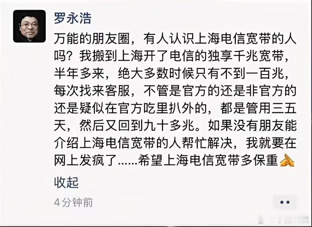 罗永浩怒怼上海电信宽带,如果不解决就要在网上发疯了…不过说起宽带虚标问题,早就不是新鲜事了,按理说千兆的宽带缩水到90兆多,确实有点儿说不过去。另外,三大运营商对外推广的兆流量不是一样的,所以计量方式也是不一样的?