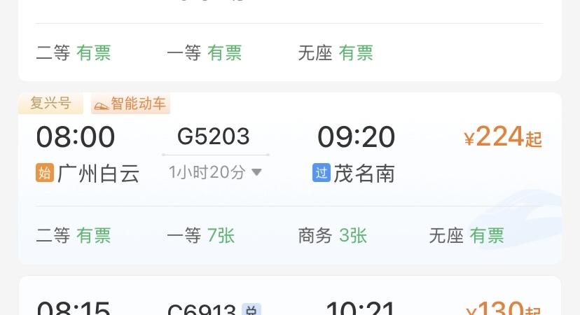 今天广湛高铁开票了,我特意查了下,直接给我看笑了。差不多的价格,时间快了一倍。去茂名价格224元,时间在1小时20分钟左右有,真的是快了很多。可以预见逢年过节,回湛江如果买不到高铁票,就得硬着头皮坐水鱼号了。按这么个情况下去,之后不知道水鱼号会不会调价,毕竟没有任何吸引力。