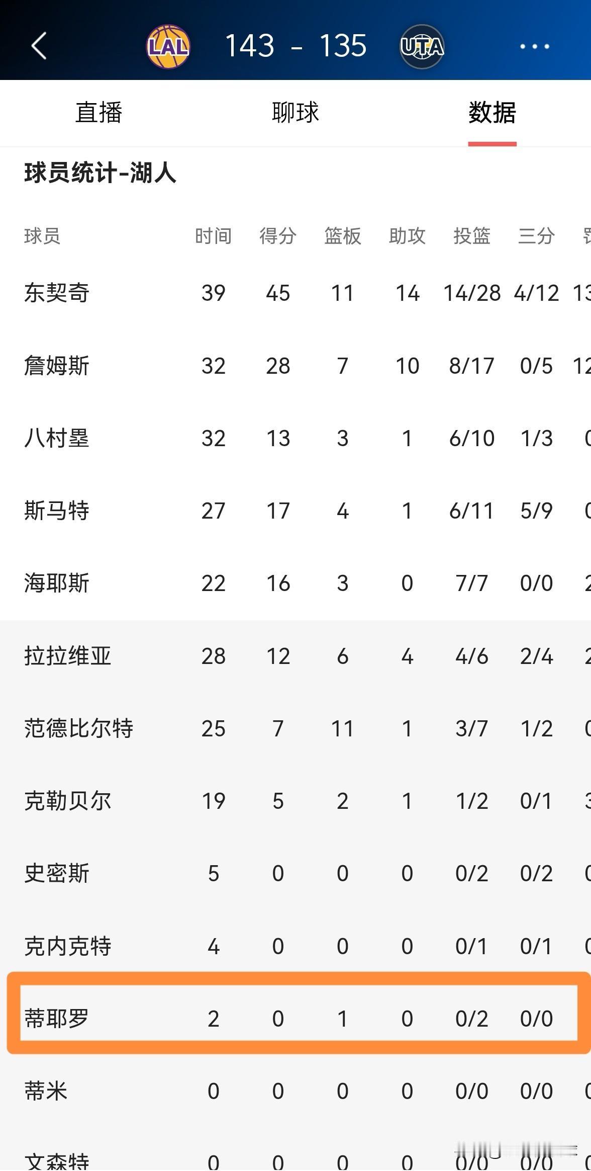 湖人新秀蒂耶罗真是活该不受重视!在今天湖人客场以143:135击败爵士的比赛中,蒂耶罗基本上遭到了主帅雷迪克的无视,全场比赛下来蒂耶罗仅仅替补出战2分钟,投篮2中0怒砍0分,不过有1篮板,还出现了3次犯规。 坦白说,当一名球员在2分钟的上场时间里就出现了3次犯规,那么这名球员肯定会遭到主帅的弃用。