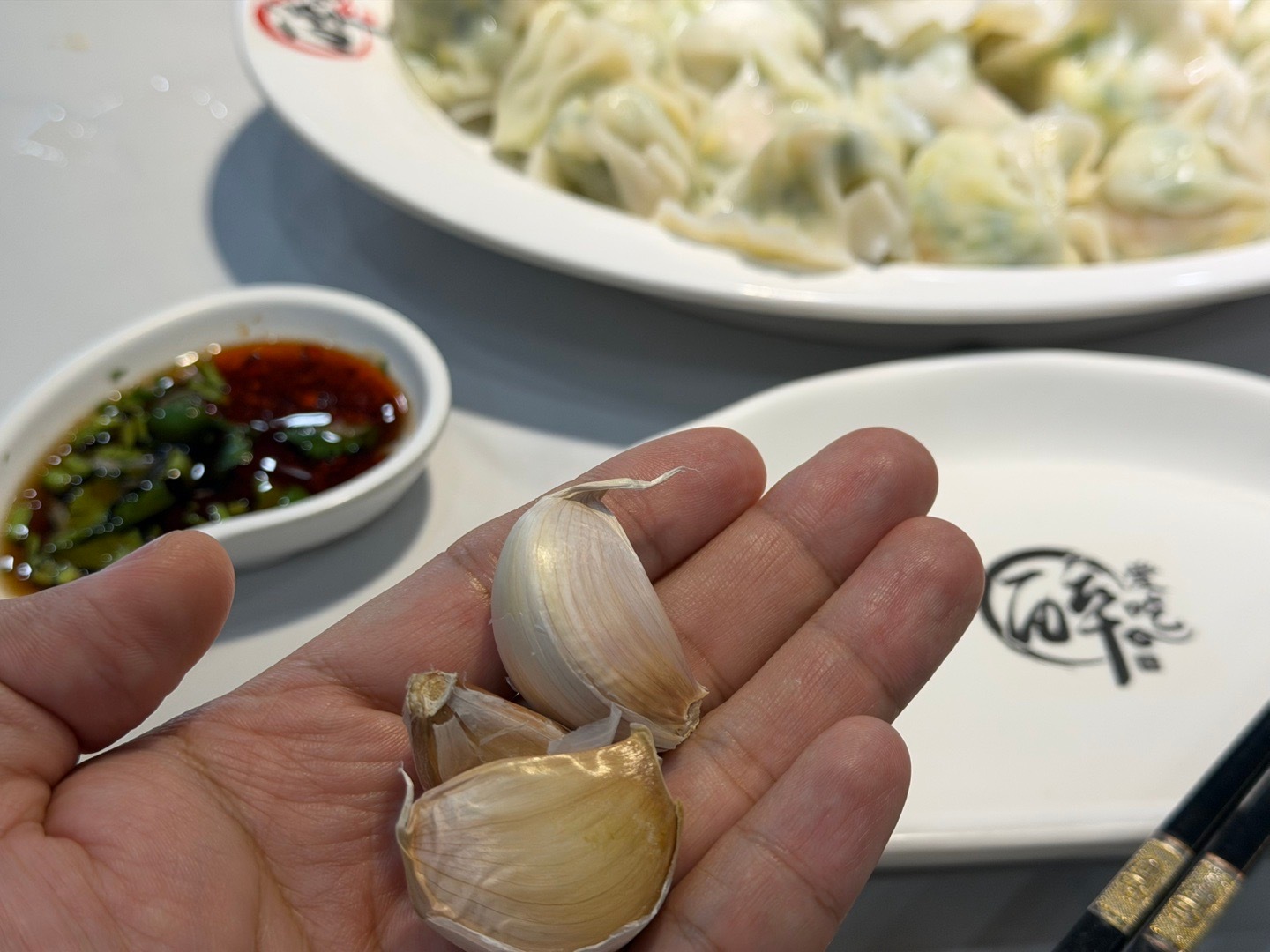 来吃水饺,拿了几瓣蒜,吃不吃呢,好纠结。因为下午还得上班,怕和同事交流一股蒜味