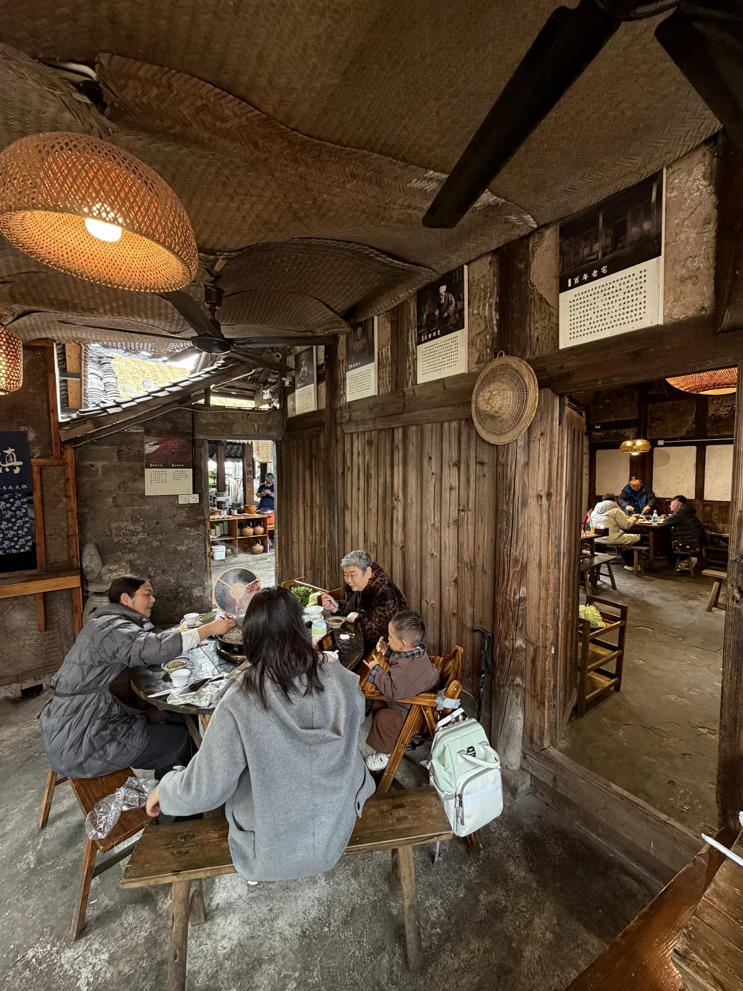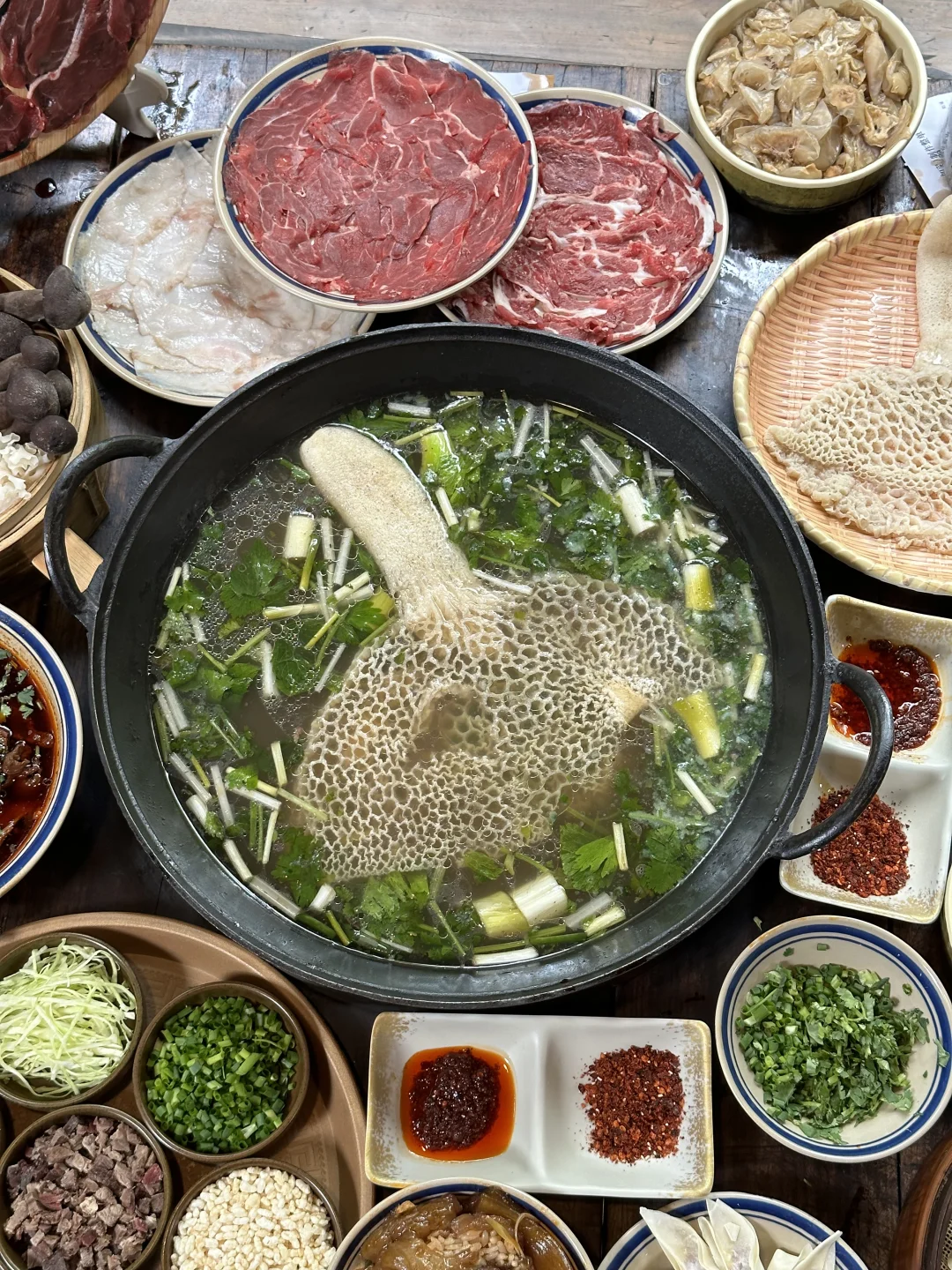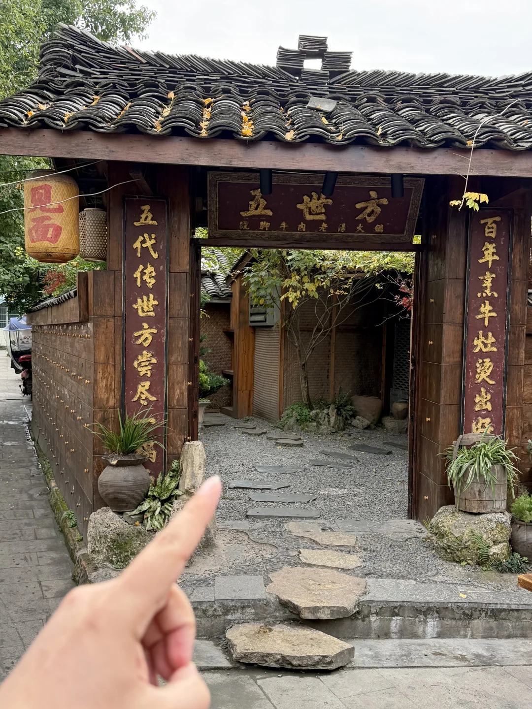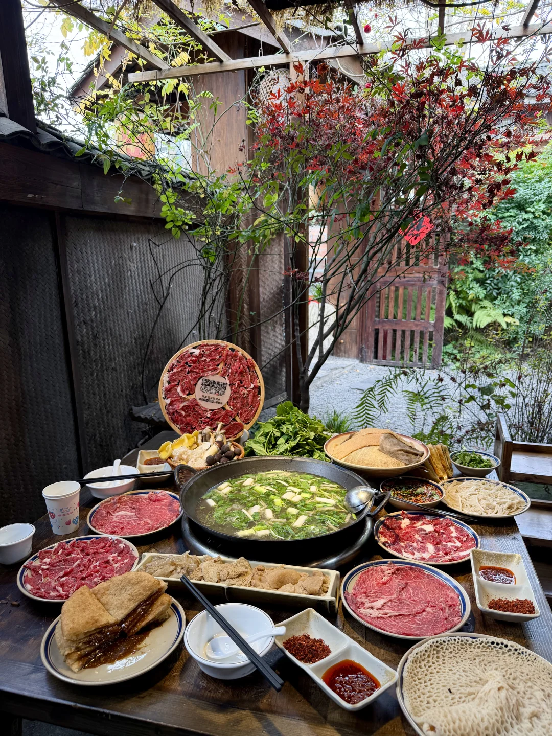 在苏稽古镇上,本地人推荐我们去的一家百年老宅里的跷脚牛肉火锅!好多都是一大家子来吃的,一走进去真的就感受到老宅的那种魅力🥹🥹!! 锅底我们选的清汤(也可以双拼),建议先煮菌菇,全是食材的鲜味!然后牛肋排和雪花牛肉(好美的大理石纹😍😍)一定要点!师傅现切的,品质肉眼可见!鲜烧牛蹄筋拌饭也好好吃!! 门口还有现做的软面牛肉锅盔,也有红糖馅的,一定要趁热吃!我们说了下次来乐山还会再吃!!