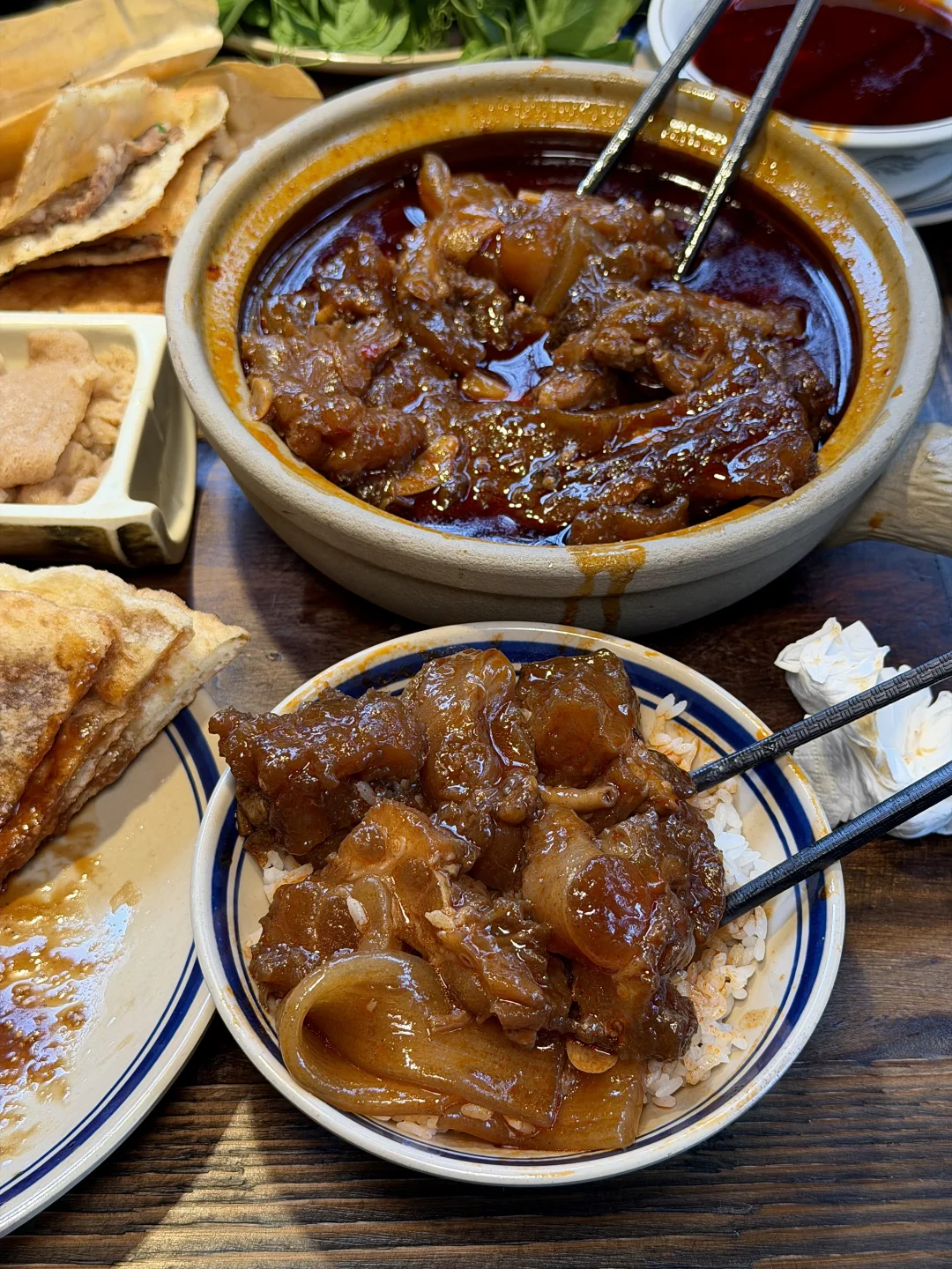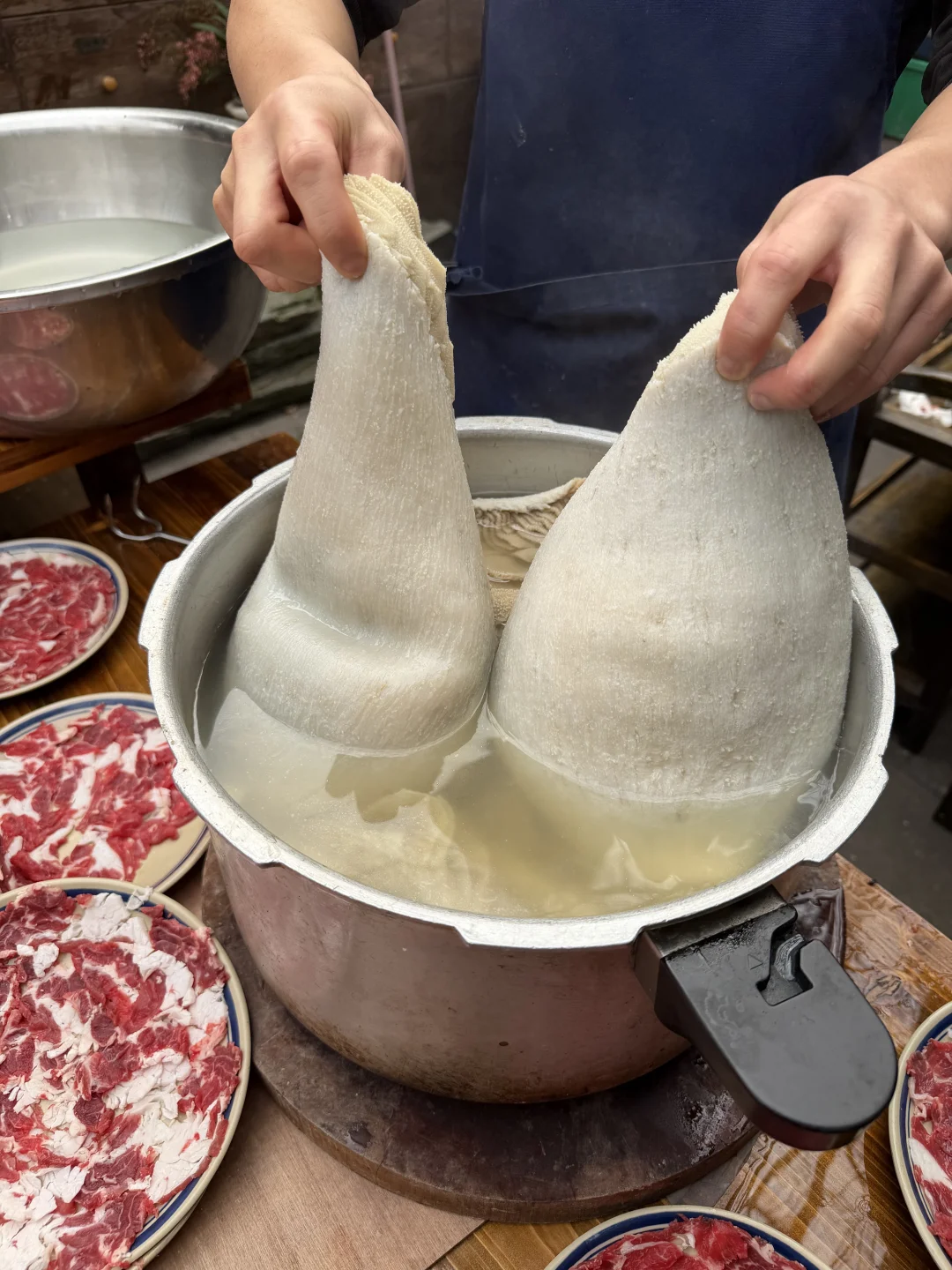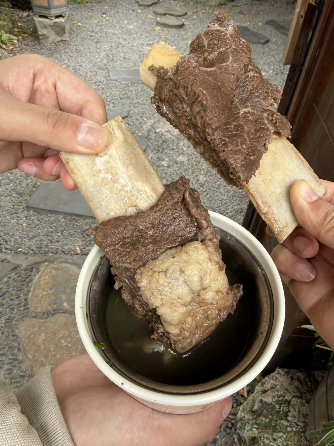 在苏稽古镇上,本地人推荐我们去的一家百年老宅里的跷脚牛肉火锅!好多都是一大家子来吃的,一走进去真的就感受到老宅的那种魅力🥹🥹!! 锅底我们选的清汤(也可以双拼),建议先煮菌菇,全是食材的鲜味!然后牛肋排和雪花牛肉(好美的大理石纹😍😍)一定要点!师傅现切的,品质肉眼可见!鲜烧牛蹄筋拌饭也好好吃!! 门口还有现做的软面牛肉锅盔,也有红糖馅的,一定要趁热吃!我们说了下次来乐山还会再吃!!