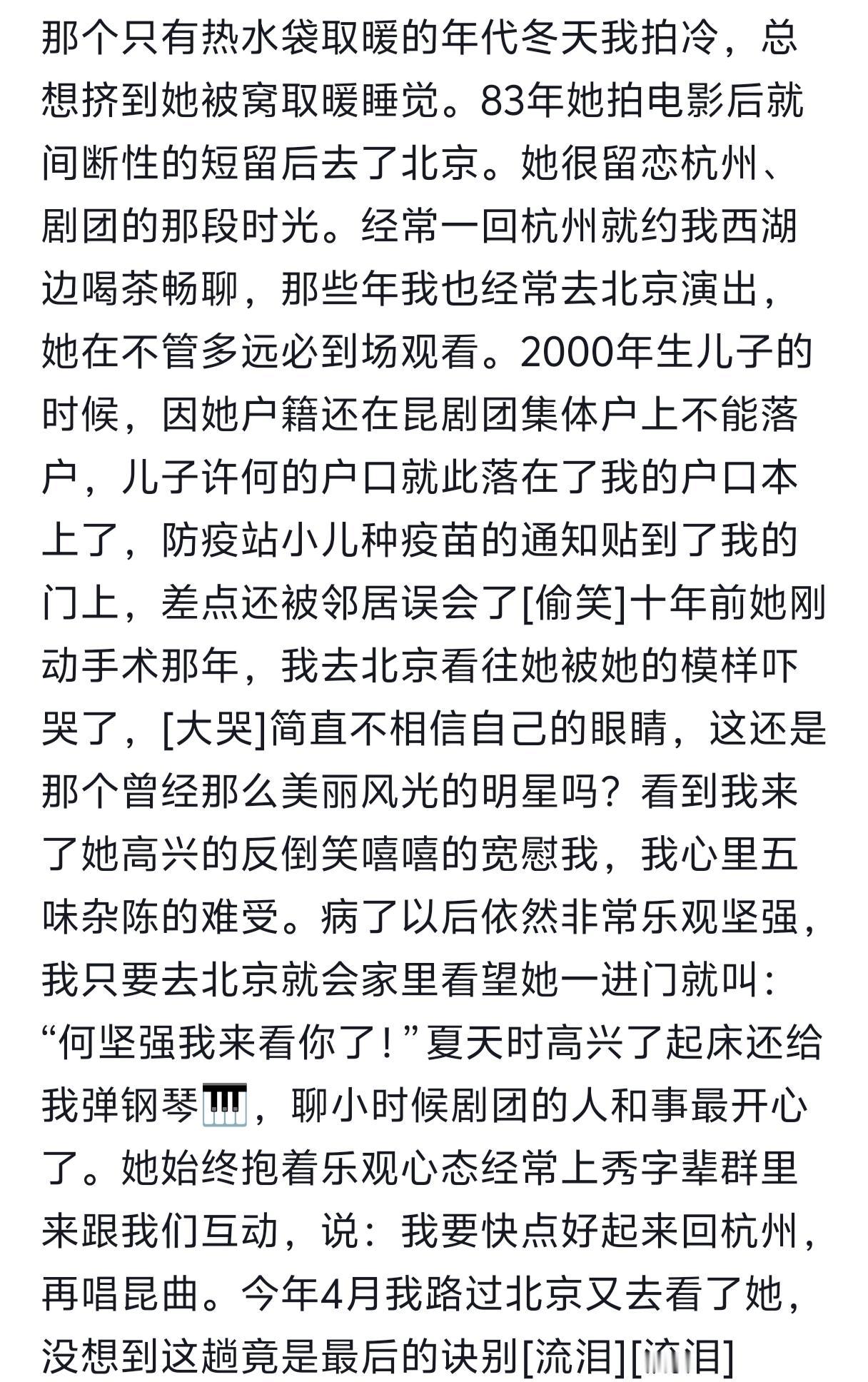 何晴的同学讲诉,十年前,何晴刚动完手术,自己前往北京去看望她,一进门就被何晴的模样吓哭了,简直不敢相信自己的眼睛,这还是那个风光无限的大明星吗? 这位同学与何晴相识于1978年浙江昆剧团,每天同吃同住,感情特别好。 直到1983年,何晴拍了电影后,便去了北京发展,但何晴仍然很怀念剧团的日子。 2000年,何晴生儿子的时候,因自己的户籍还在昆剧团集体户上不能落户,儿子许何的户口便落在了同学的户口上。 何晴手术后,同学前去看望她,看到手术后何晴憔悴的模样,心里很不是滋味。 反而是何晴,为了不让大家担心,还笑嘻嘻的安慰同学。 患病后,何晴对病情一直保持低调,坚强乐观的生活着,总说:要快点好起来回杭州, 再唱昆曲。 今年4月份,这位同学路过北京,又去看望了何晴,没想到却成了最后的诀别。 多么珍贵的友情啊!再回首佳人倩影仍然留在心中。 她走了,除了伤感和些许遗憾,还留下了美丽的形象和美好的回忆!