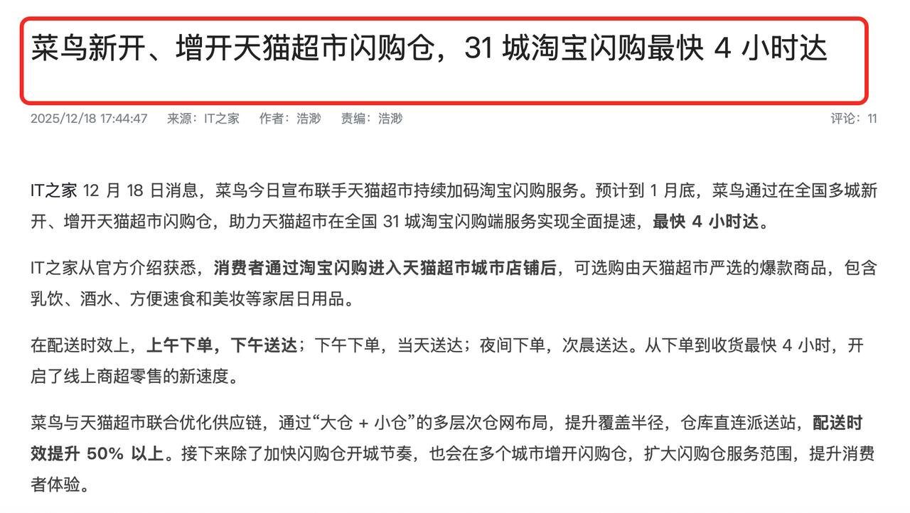 又一个重磅消息,事关消费,和每一个人都密切相关! 有媒体报道,刚刚菜鸟宣布到1月底,要在全国30多个城市开出天猫超市闪购仓,持续加码淘宝闪购投入。 这也就意味着,未来消费者能实现,上午买中午到,下午买晚上到,最快4小时达达极速服务。 天猫超市是阿里生态内最为专注家庭消费的业务,类似山姆,通过独特选品来满足家庭消费。天猫超市接入闪购,通过供应链升级,一方面,可以提供更为丰富的品类供给;另一方面,也将原有的半日达、次日达,继续向最快4小时达推进,体验进一步提升。 而这个服务升级的背后,其实就是在外卖之战中阿里生态协作能力的体现。是阿里饱和式打法的又一案例。 今年11月份的阿里财报就显示,即时零售业务收入同比增长60%。此外在财报电话会议中还提到了,第二阶段经济效益符合预期,增加了对即时零售长期投入的信心。阿里生态业务也在加速进驻淘宝闪购,持续扩大优势。
