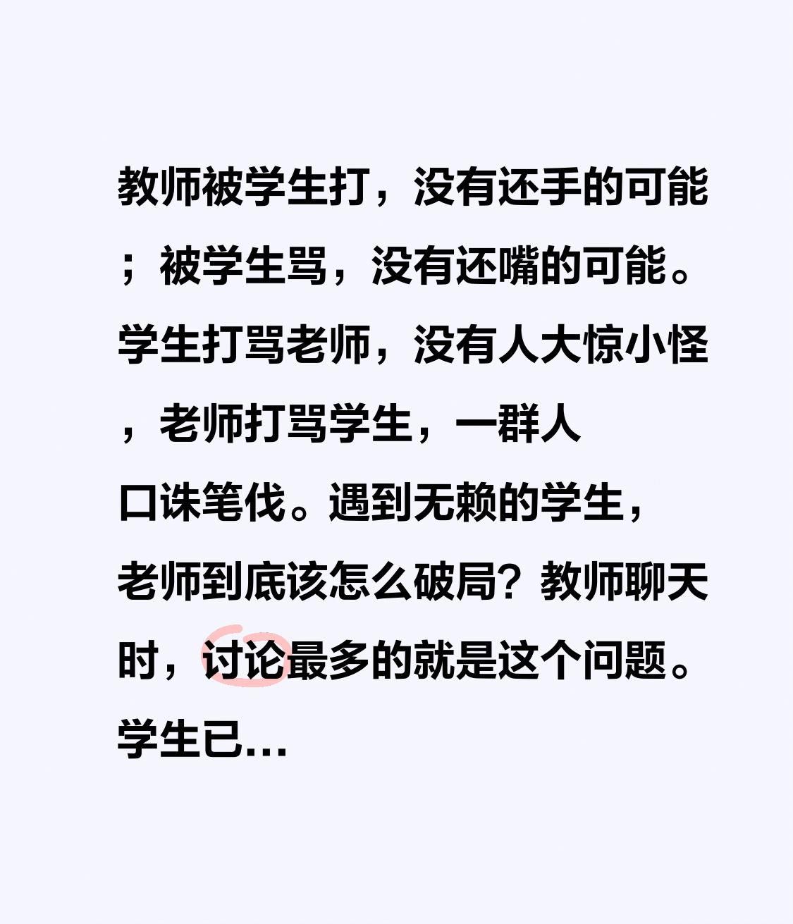 教师被学生打,没有还手的可能;被学生骂,没有还嘴的可能。 学生打骂老师,没有人大惊小怪,老师打骂学生,一群人口诛笔伐。 遇到无赖的学生,老师到底该怎么破局? 教师聊天时,讨论最多的就是这个问题。 学生已经反向拿捏住了老师,知道老师拿他们没有办法。 连小学三年级的学生,都敢肆无忌惮的给老师顶嘴。 几个小学生一起谈话,直接喊着老师的名字,说他们的缺点。 初中学生敢对老师做的事,更是五花八门。 学生厕所里,写得都是老师的名字,有的名字旁边还画着一个乌龟。 他们倒是不再喊老师的姓名,而是变成了“老张”和“老王”,喊的很随意,就像喊出租车司机一样。 学生上课睡觉,老师喊醒了他,又批评了几句,就被学生打了。 下课铃声响起了,老师多讲了三分钟,下午就被叫去教育局喝茶,一问才知道,被学生投诉了。 这样的事情,都是发生在我校,三天三夜也说不完。 老师到底该怎么挺直腰板? 如果再让老师弯着腰教书育人的话,未来的接班人将会怎样? 很多教育专家不是擅长研究“用爱感化”“师生平等”吗?一线教师都是按你们说的做的,现在进退维谷了啊? 来个专家,帮助教师破局吧!给老师们支支招,当被学生打,被学生骂时,老师该怎么办啊?