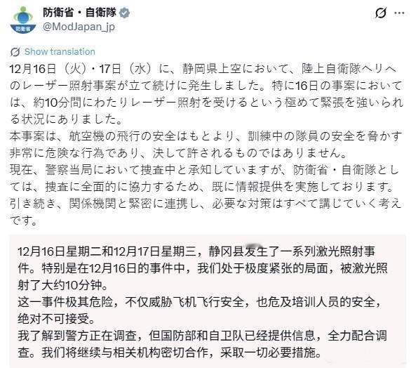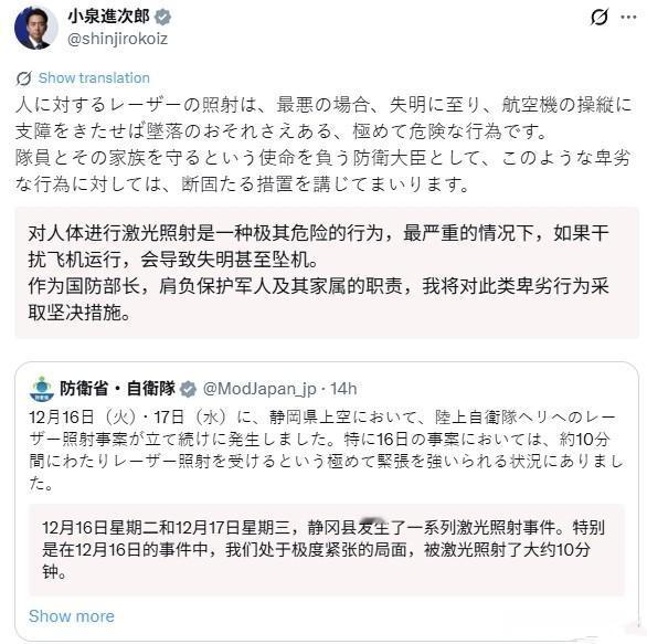 日本战机又被照,防卫相彻底急了,日网民臆测:中国干的! 当地时间18日,日本防卫省通报称,16日和17日,在日本静冈县空域,日本陆上自卫队的直升机连续两天遭到激光照射。其中,16日的事态最为严重,直升机被激光照射了约10分钟。自卫队已经报警。 日本防卫相小泉进次郎这次也彻底急了,直言这是“卑劣行为”,还说这种激光照射会导致失明甚至坠机,后果极为严重,他将对于这种行为“采取坚决措施”。 从公开信息锁定的三个基本事实来看,将日本静冈县直升机激光照射事件与中国挂钩,本身就是缺乏逻辑的无稽之谈,哪怕从常识和过往案例来看,这种关联也站不住脚。 先看事发地点,静冈县是日本妥妥的内陆核心区,距离东京仅150公里,这种腹地地带的地面照射源,若真与中国有关,意味着中国力量要悄无声息深入日本核心内陆。 且不说这种操作在技术上需要突破多重防线,从外交和战略层面更是毫无动机,中国一贯恪守国际法尊重各国领土主权,绝不会做出这种既无意义又破坏地区稳定的行为。 再看照射源的地面属性,这直接把事件指向了日本本土范围内的个体或群体行为,毕竟地面照射的范围和机动性有限,不可能是境外力量隔空操控,更不可能是远在千里之外的中国所能精准实施的。 而目前警方尚未抓获嫌疑人的现状,恰恰说明事件仍处于日本内部调查阶段,在没有任何证据的情况下就想拉中国背书,本质上就是借题发挥的炒作。 更关键的是,激光照射飞机在日本本土本就不是新鲜事,早有大量同类案例证明这是日本内部亟待解决的安全隐患,与中国毫无关联。 据日本海上自卫队披露的信息,仅神奈川县厚木基地自2013年度以来,就发生过70多起夜间飞机遭激光照射的事件,其中日本自卫队飞机就占了约10起,涉及巡逻机、直升机等多种机型,照射源多来自基地周边的东京都町田市方向。 而且冲绳县普天间机场附近的美军机也多次遭遇类似情况,民航客机被照射的案例在日本各地更是频发。 这些案例覆盖了十余年时间,涉及多个地区和多种机型,显然是日本本土存在的常态化问题,要么是民间人员出于恶作剧,要么是别有用心的本土势力所为,从未有任何一起被证实与中国相关。 如果真要找关联,这些频发的本土案例,反而更能说明此次静冈县事件大概率是日本内部问题的延续,而非外部力量介入。 从全球范围来看,激光照射飞机事件的普遍存在,进一步佐证了这类事件的民间属性,与国家行为无关。 国际航空组织的资料显示,随着大功率激光在网络上轻易可购,这类照射事件多是个人故意行为,要么是缺乏对后果的认知,要么是明知危害仍蓄意破坏,甚至有受影视剧中虚构场景影响的误导者模仿尝试。 美国的统计数据更能说明问题,2023年美国联邦航空局收到的激光照射飞机事件报告多达13304起,创下2010年开始统计以来的最高纪录,较前一年激增41%,而这些事件无一例外都是美国本土民间行为,美国联邦调查局甚至需要悬赏1万美元打击这类行为。 连航空业发达、安保体系完善的美国都无法杜绝此类民间事件,日本出现类似情况自然也在情理之中,将这种全球普遍的民间安全问题硬扯到国家层面,甚至嫁祸中国,显然是找错了归因方向。 值得一提的是,日本防卫相小泉进次郎此次急着将事件定性为“卑劣行为”并扬言“坚决措施”,却对事件的本土属性视而不见,这种态度难免让人怀疑其借题发挥的意图。 要知道小泉进次郎此前就有过类似的不实炒作,曾宣称中国战机“激光照射”日本战机,最后被证实是日本战机先抵近中国辽宁号航母公海演习区域侦察,中国战机依法驱离后的正常应对,所谓“照射”纯属倒打一耙。 此次事件发生在日本内陆核心区,明明是自家内部的安全漏洞,却又想故技重施引导舆论抹黑中国,这种操作实在难以服众。 说到底,这类事件的解决关键在于日本加强本土安全管控,排查民间激光器材的流向,而非动辄拿中国说事转移视线,毕竟再怎么炒作,也改变不了事件与中国毫无关联的基本事实。