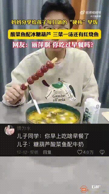 浙江一位妈妈给上高中的儿子做早餐,儿子本来满心期待,可当他看见妈妈端上来的早餐后,顿时就一句话也说不出来了。 原来妈妈给他端上来的早餐,不是米饭和粥,也不是面条和包子,而是酸菜鱼和冰糖葫芦,旁边还配了一瓶牛奶。 有网友表示,这也太“硬核”了吧? 没想到这位妈妈直言,自己早餐还做过红烧鱼和炖汤,每一天都惊喜满满。 网友看完这段视频,都觉得这位妈妈真是打开了早餐新次元啊,她做的早餐全都是硬菜,实在是让人大开眼界了。 不过让上高中的孩子早餐吃酸菜鱼和冰糖葫芦,这种搭配未免也太奇怪了,毕竟在很多人眼里,早餐都是要以清淡和营养为主,但酸菜鱼明显是刺激性食物。 而且这两样东西虽然好吃,但不抗饿啊,没有碳水的话,对于一个上高中的男孩来说,是无法保持体力的,而且对身体健康,也有一些影响。 虽然这位妈妈每天的早餐都在创新,说明她十分疼爱儿子,但这种早餐其实并不是很合适,也缺乏一些营养,还是需要再改进一下。大家怎么看呢?