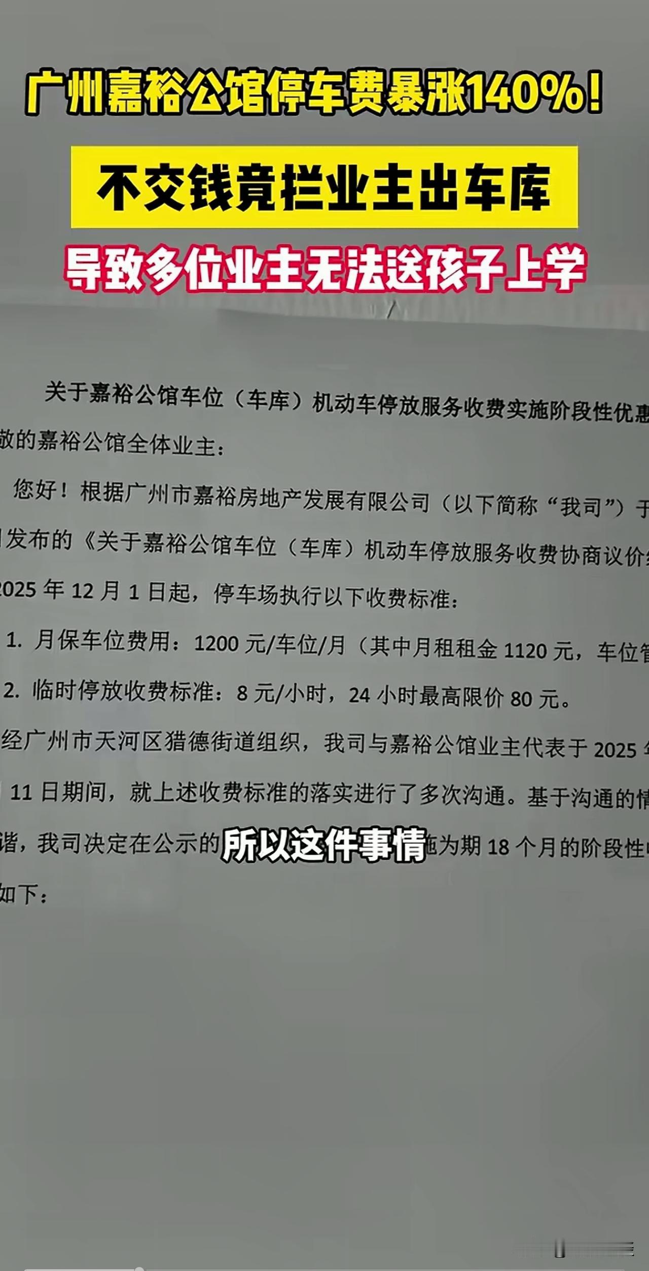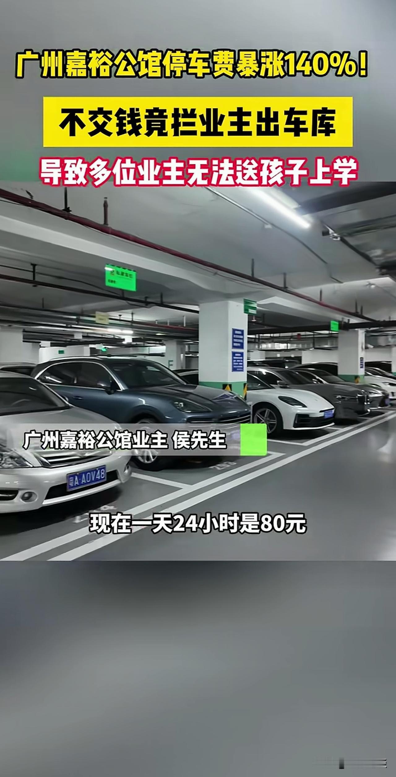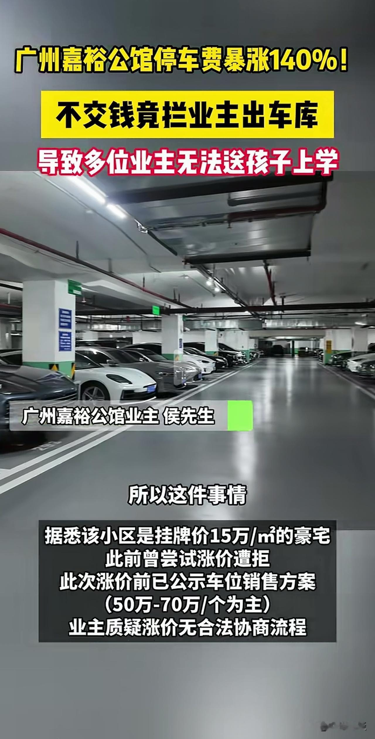 广州一单价15万的高档小区,停车费月保从500元猛涨140%,高达1200元,遭