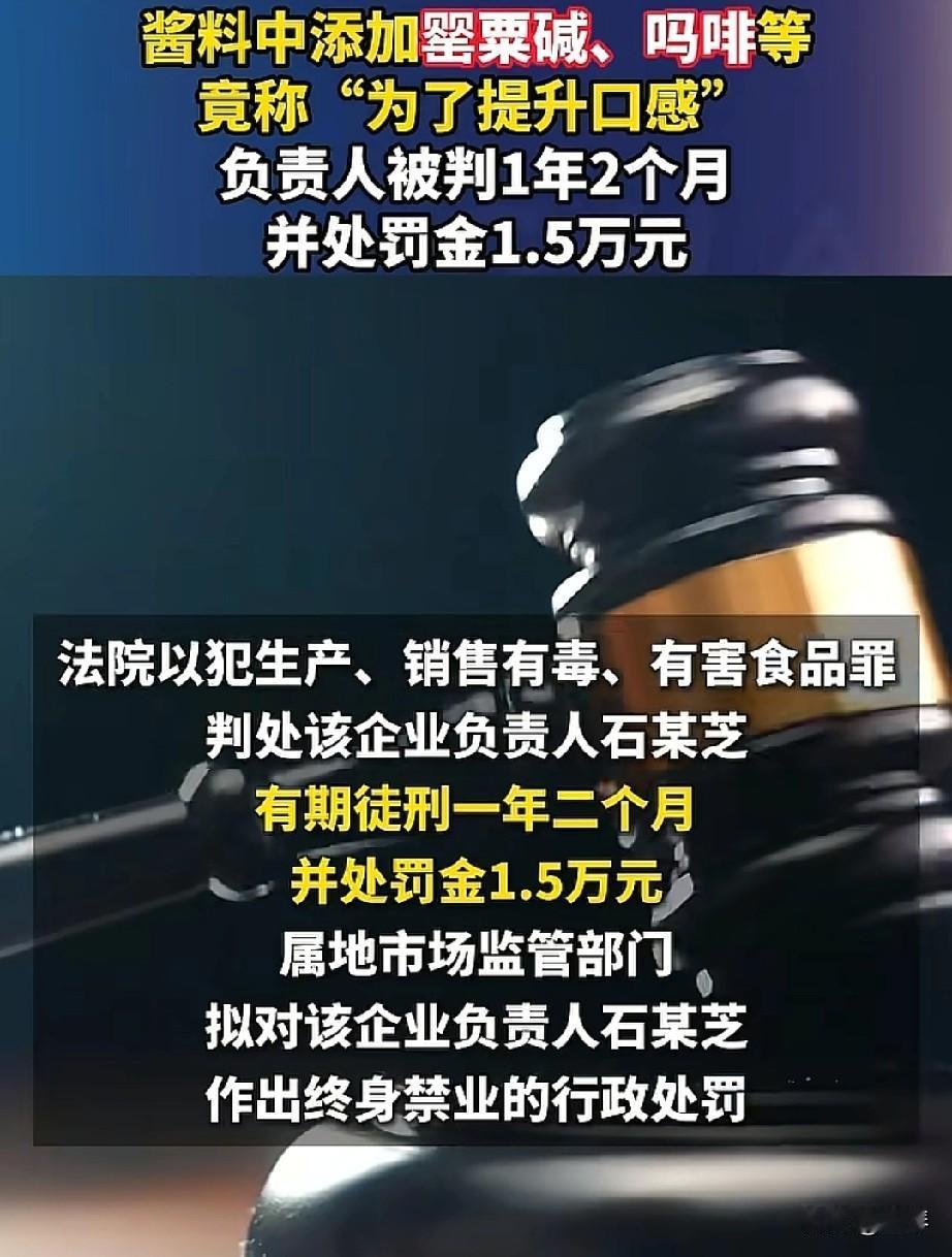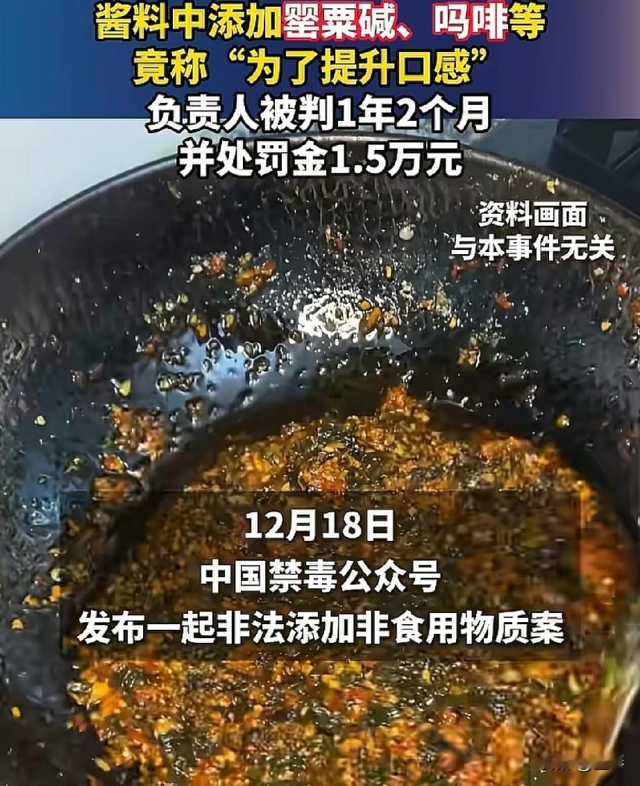 武汉一食品厂酱料竟掺罂粟碱、吗啡、可卡因等毒品,黑心添加剂的背后到底是谁在作恶? 武汉江夏区天翼食品加工厂的一则案件,让食品安全的警钟再次敲响。 市场监管部门抽检时发现,该厂生产的紫苏酱中竟检出罂粟碱、吗啡、可待因、那可丁等违禁成分,负责人石某芝还辩称此举是“为了提升口感”。 为了让消费者产生依赖、拉动产品销量,这家食品厂不惜在酱料里掺入这类会对人体造成损害的物质,全然漠视食品安全法规和公众健康。 最终,法院以生产、销售有毒、有害食品罪,判处石某芝有期徒刑一年二个月,并处罚金1.5万元,属地市场监管部门还拟对其作出终身禁业的行政处罚。 我们不禁要问:将毒品渗透到食品中,这黑心产业链背后,到底是谁在侵害我们的生命安全,? 食品