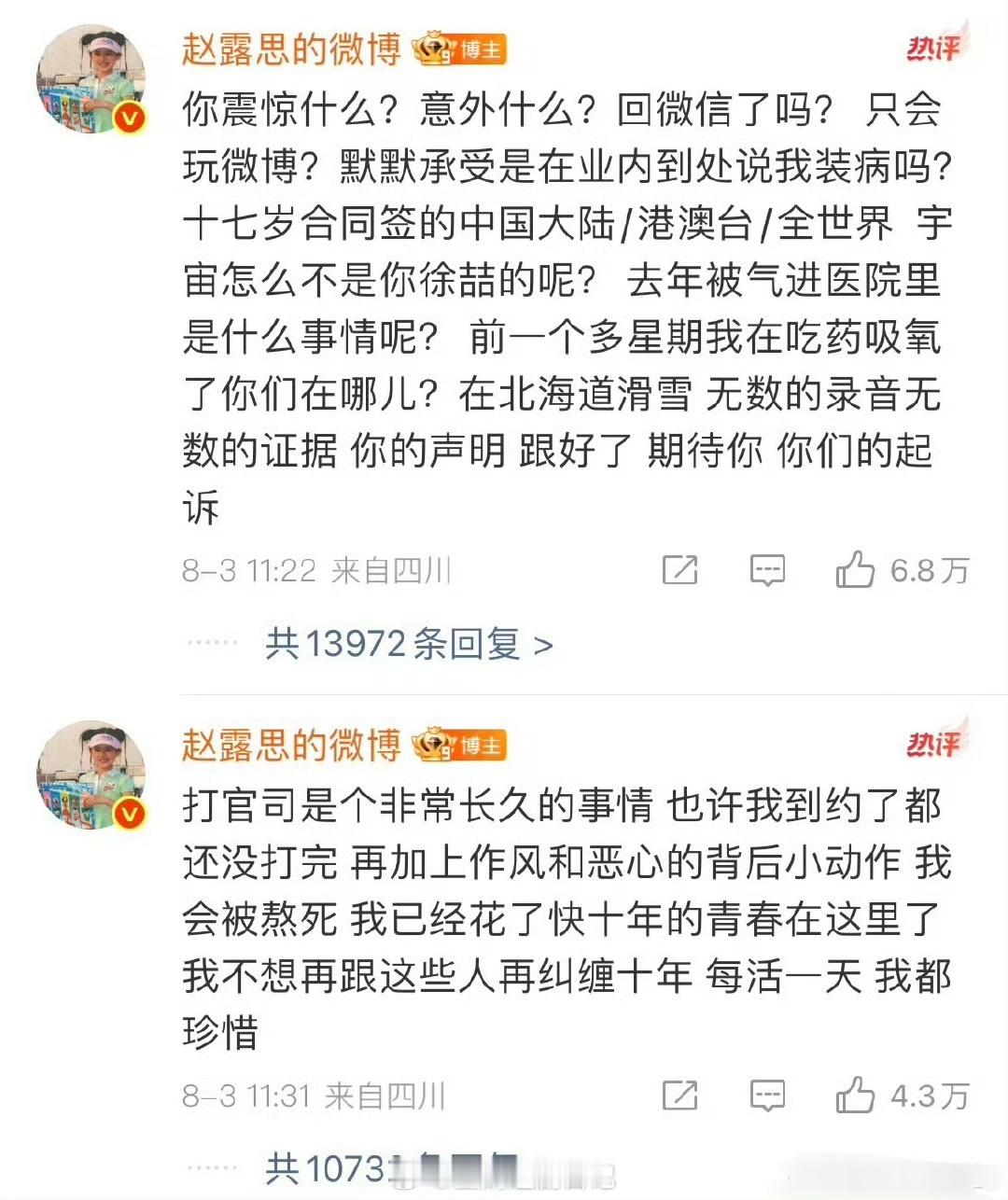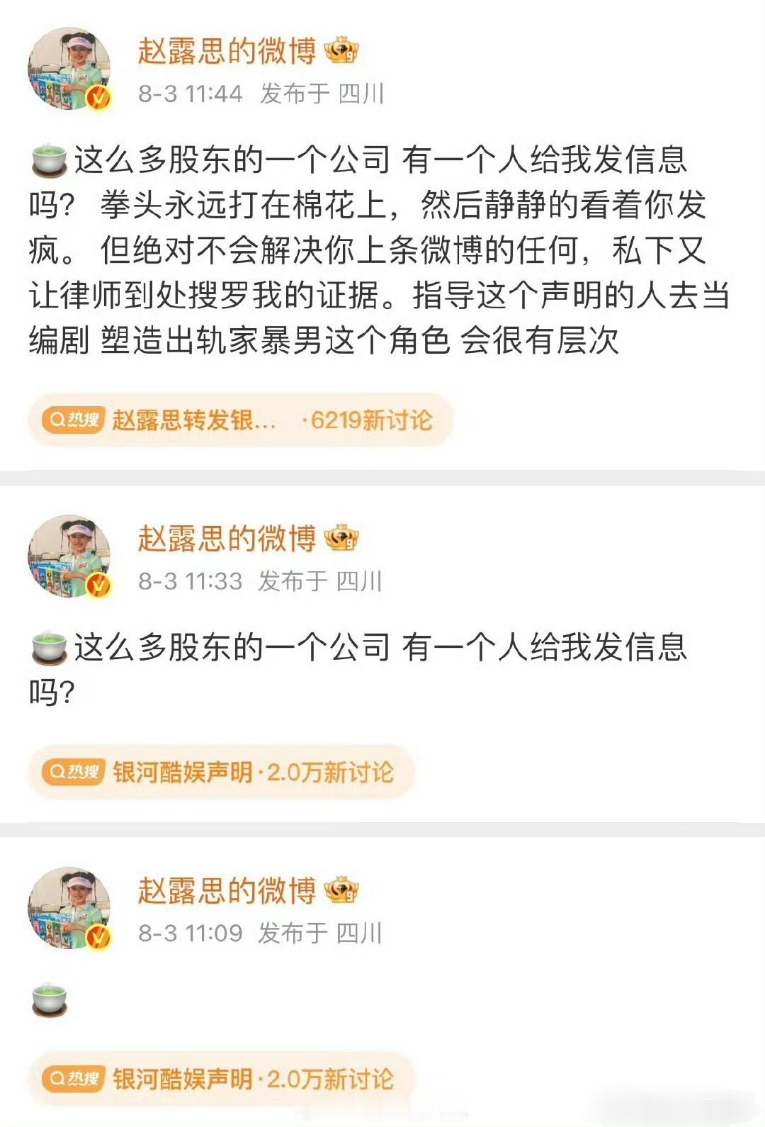 看到大家说,想起了赵露思~我是很佩服这份勇气的,不是每个人都有破罐子破摔重新再来的勇敢的。反正她现在合约问题解决了,不管过程如何最终结果是满意的…吃过的苦也值了!觉得这样的人很勇敢,有的人说不体面但是体面在现实面前一文不值 就哪怕普通人是生活中遇到事情了,是要体面还是要达到最终目的呢?不是无路可走了谁不想要体面,只是不想任人欺负罢了。记得当时公司发文,她直接评论转发贴脸骂 比起鞠婧祎 丝芭的事突然觉得银河酷娱,蛮良心的