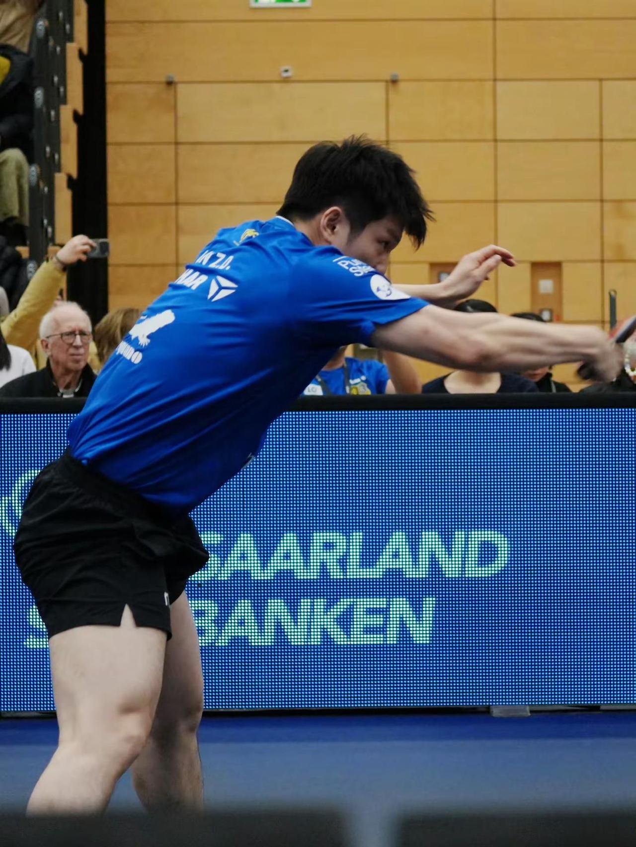 在萨尔布吕肯的热身训练场,两个老人特意过来和樊振东打招呼,原本站着的樊振东非常有