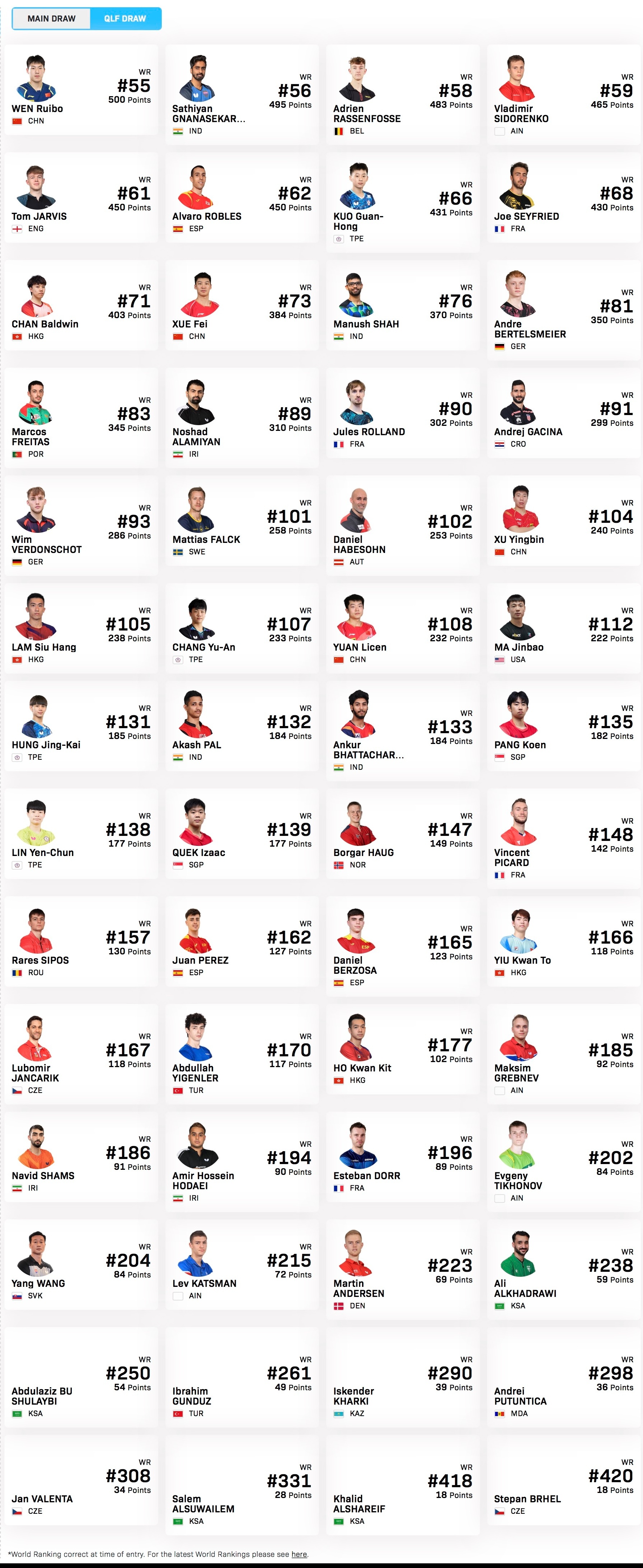 WTT常规挑战赛马斯喀特站2026【男单参赛名单】比赛时间:1.19-1.24正赛:林诗栋🇨🇳,梁靖崑🇨🇳,向鹏🇨🇳,杜达🇩🇪,弗朗西斯卡🇩🇪,贾哈🇺🇸,陈垣宇🇨🇳,格罗特🇩🇰,普卡🇭🇷,卡尔伯格🇸🇪,阿萨尔🇪🇬,泊雷特🇫🇷,塔卡🇮🇳,雷德齐姆斯基🇵🇱,黄镇廷🇭🇰,巴德🇫🇷,沃尔瑟🇩🇪,陈俊菘🇨🇳,黄友政🇨🇳资格赛:温瑞博🇨🇳,纳纳塞卡然🇮🇳,拉森福斯🇧🇪,西多仁科AIN,贾维斯🏴,罗布勒斯🇪🇸,郭冠宏(中国台北),塞弗里德🇫🇷,陈颢桦🇭🇰,薛飞🇨🇳,沙🇮🇳,贝特斯梅尔🇩🇪,费雷塔斯🇵🇹,阿拉米扬🇮🇷,罗兰🇫🇷,加奇纳🇭🇷,维东斯霍特🇩🇪,法尔克🇸🇪,哈贝森🇦🇹,徐瑛彬🇨🇳,林兆恒🇭🇰,张佑安(中国台北),袁励岑🇨🇳,马金宝🇺🇸,洪敬恺(中国台北),帕尔🇮🇳,巴塔查尔吉🇮🇳,冯耀恩🇸🇬,林彦均(中国台北),郭勇🇸🇬,豪格🇳🇴,皮拉德🇫🇷,司珀斯🇷🇴,佩尔兹🇪🇸,贝尔佐萨🇪🇸,姚钧涛🇭🇰,扬察里克🇨🇿,伊根勒🇹🇷,何钧杰🇭🇰,格列布涅夫AIN,沙姆斯🇮🇷,霍戴伊🇮🇷,多尔🇫🇷,蒂霍诺夫AIN,汪洋🇸🇰,卡兹曼AIN,安德森🇩🇰,阿尔哈德拉维
