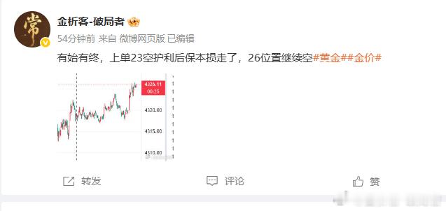 有始有终,上单23空护利后保本损走了,26位置继续空黄金金价