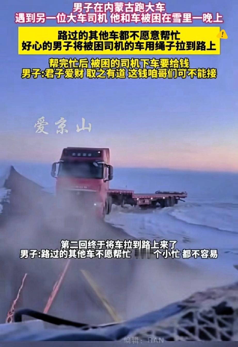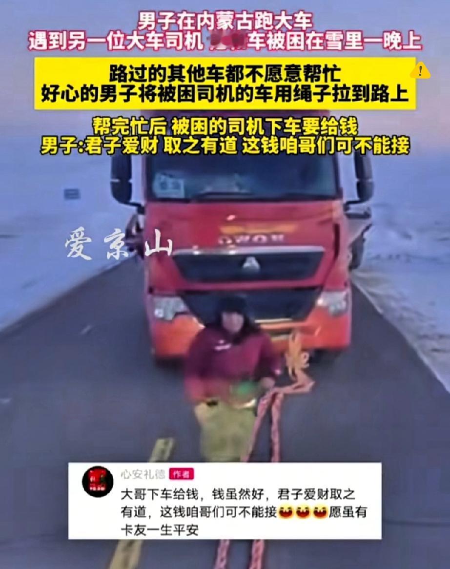 零下20多度的内蒙古雪地,困住的不只是货车,更是一条人命啊! 跑大车的大哥路过,看到被困司机冻了一整晚,之前好几辆车都视而不见,他二话不说就伸手帮忙。 第一次牵引绳直接拉断,换谁可能都放弃了,但他偏不,换了办法再来一次,硬生生把深陷雪地的货车拽了出来。 这哪是帮个忙,分明是在极寒里抢回一条命,保住一个家的顶梁柱。 司机掏钱感谢时,大哥一句“君子用钱取之有道”太戳人了! 善良从不是理所当然,而是明知麻烦还愿意伸手的选择,这才是卡友之间最珍贵的抱团取暖。 比起那些冷漠路过的人,这位大哥的举动让寒冬都暖了。 你在路上遇到过愿意主动搭把手的陌生人吗?来聊聊那些温暖过你的瞬间~