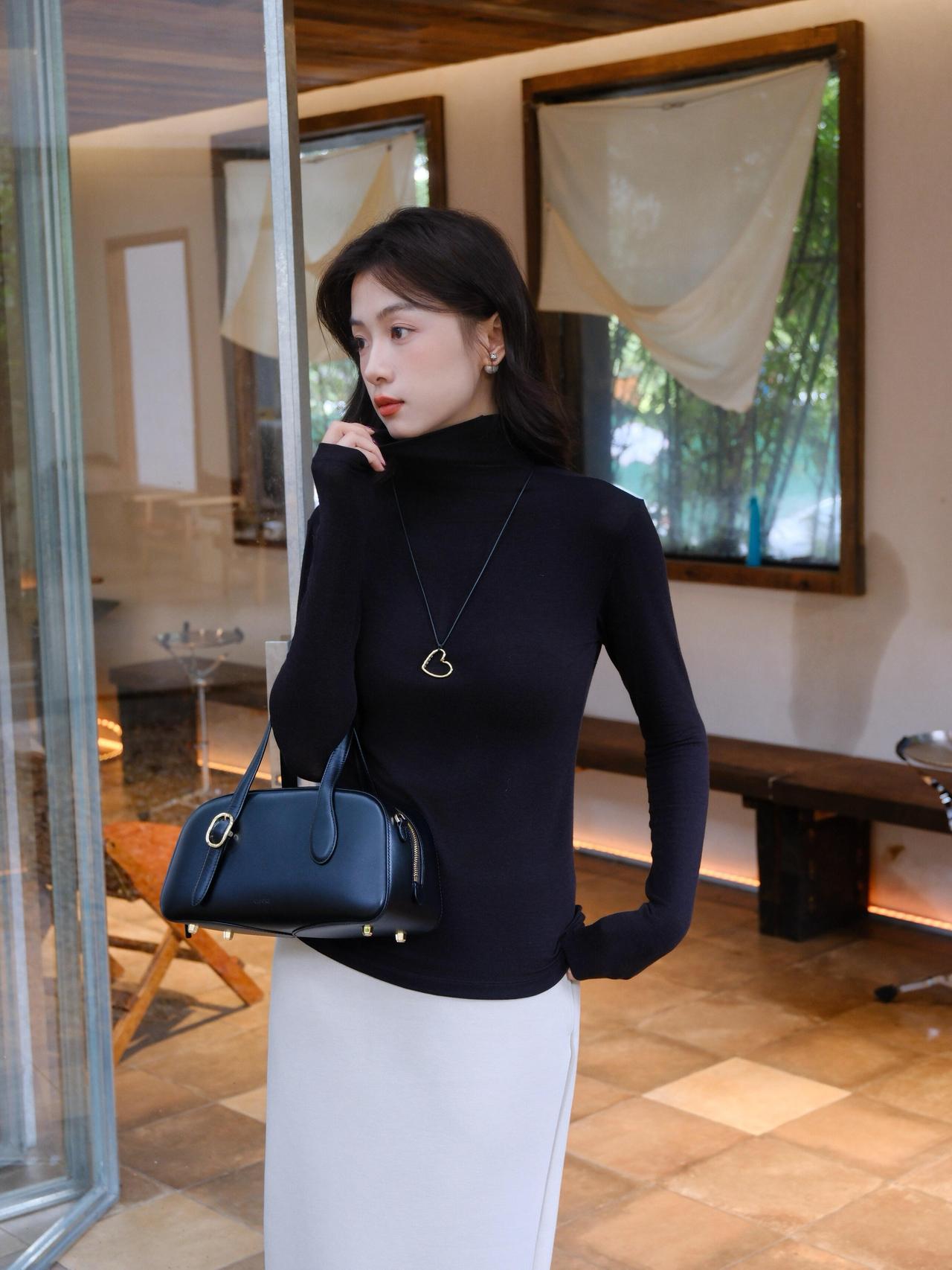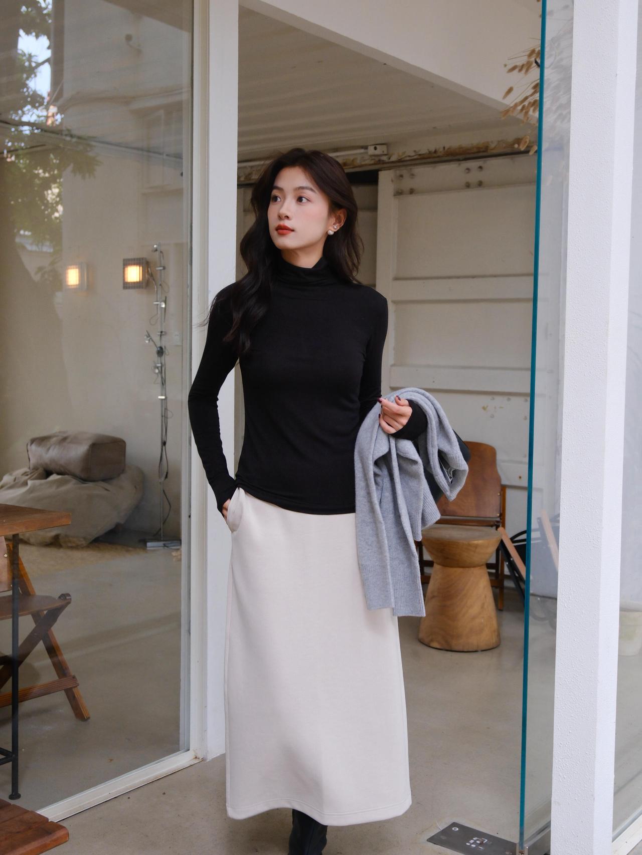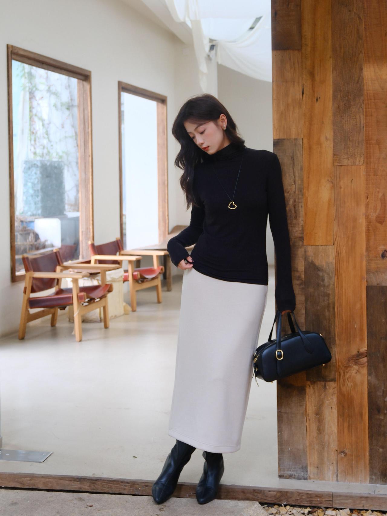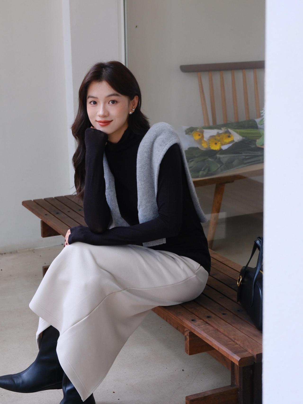 秋日穿搭指南黑色高领毛衣+灰色背心+白色长裙简约而不失优雅
