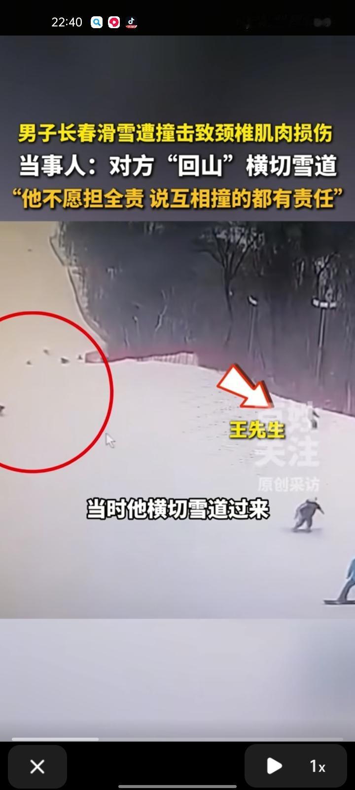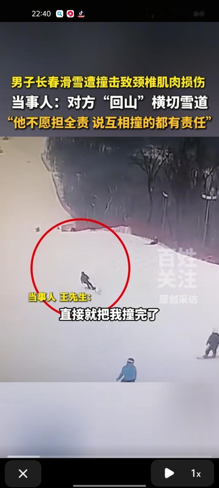 12月18日,吉林长春。王先生在长春庙香山滑雪场滑雪时,被另一滑雪者撞倒致颈椎肌肉拉伤,造成短暂性失忆。他表示,当时他横切雪道过来,他这个动作是回山,是一个山路又绕回来了。我在雪上躺了十多分钟,因为撞完了一直头晕,抬头就恶心。经医生诊断,自己是脖子肌肉损伤,颈部活动受限,需要戴上颈部固定器,七天内需要静养不能运动。 最主要的是,王先生去找自己被撞的那个人,他居然来一句“不是我的责任”。目前,王先生委托律师全权处理此事。