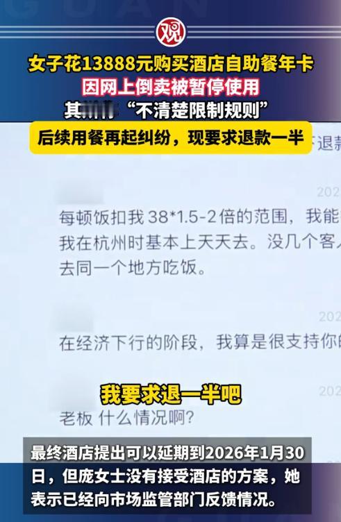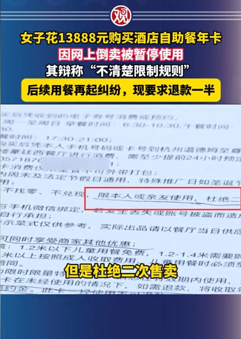 浙江杭州,女子趁着活动买了某酒店的自助餐年卡,一共花了13888元,每天可以吃一次,这可比吃快餐便宜还省事。可女子才用了4个月,卡就被酒店给停用了。酒店方查到女子在网上售卖了8次年卡权益,而合同中明确约定杜绝二次销售。女子不服,称自己并未转卖,而是转给亲友使用了,而且酒店也未对该条款作出明确解释。之后女子要求退费,但遭到了拒绝。(来源:观察者网) 去年的一个大型购物日,庞女士看到了某大酒店的年卡推广,根据广告宣传,称只要花13888元,就可以吃一整年的自助餐。 庞女士立即算了下,按照每天一顿自助餐来算,大概平均每天的费用是38元。如果去那些自助餐厅,起码都得100元以上,这让庞女士十分心动,最终购买了一张年卡。 刚购买完年卡后,庞女士在这家自助餐厅吃了几次,感觉还不错,菜品味道都可以,食材也新鲜。 前4个月,庞女士几乎把酒店的自助餐厅当做了食堂,几乎每天都会去吃一次。 到4月17日,庞女士的卡上显示已经使用了92次。这天,当庞女士再次刷卡准备用餐时,机器突然提示卡片已暂停使用。 庞女士去找餐厅经理询问情况,经理查询后称,因为发现了庞女士在某平台上倒卖了8次年卡权益,该行为已经违反了杜绝二次销售的规定,而且酒店多次提醒,但庞女士却无视提醒,所以卡被停了。 庞女士表示,这张卡不是能给亲友使用吗?自己就是给亲友使用的。然而经理觉得庞女士说的话不可信,毕竟给自己亲友使用没必要挂在平台上还放上了价格。 直到后来庞女士才承认,自己是把权益卖给了有需要的人,让那些花不起这个大价钱却又想吃自助餐的人来体验一下。 庞女士表示,自己并不是为了倒卖赚大钱,1700元的成本才卖了800元,这不能算倒卖。 经理见庞女士承认把权益转卖给别人后,又不承认自己是为了倒卖赚钱,于是翻出了购买年卡的网络页面,其中第5条显示:“本卡不找零,不兑现,限本人或亲友使用,杜绝二次销售”。 也就是说,庞女士可以把卡的权益送给亲友使用,但不能对外销售。 经理表示,庞女士已经卖了8单权益,这明显超出了权益在亲友之间转让的范畴,所以庞女士的行为已经构成违约。 不过,毕竟庞女士购买了年卡,酒店也不可能一直不让她用卡,所以给出了一个完美解决方案,只要庞女士写一份停止倒卖的保证书,酒店就会恢复卡的使用权限。 按道理来说,庞女士的确做得不对,只要保证以后不倒卖,还可以继续使用这张卡。 可庞女士却认为酒店这种强制行为让她十分不舒服,而且她坚持认为酒店没有亲口告知杜绝二次销售。 庞女士表示已经不想在这家酒店用餐了,所以要求酒店退卡,退还半年的卡费6000元。 经理对此表示,庞女士已经使用了92次。如果按照每次100元来算,那也要9200元了,而年卡总费用才13888元,所以不可能退还6000元。 之后,庞女士找来记者帮忙维权。酒店方做出了让步,同意将年卡的有效期延至2026年11月份。 但庞女士并未同意,她认为酒店没有诚意,只是想拖延时间。目前,庞女士已经向市监部门投诉了该酒店,事情仍在处理中。 对于此事,有网友表示,这酒店退出的年卡居然还能让亲友使用,以前我只见过只限本人使用的。 还有网友表示,把卡的权益放网上卖,本来一顿才38元,你卖个七八十,那酒店能不找你的麻烦吗? 那从法律角度来讲,庞女士的行为违约了吗? 庞女士主张自己并不知道卡不能二次销售。 《消费者权益保障法》第8条规定,消费者享有知悉其购买、使用的商品或者接受的服务的真实情况的权利。 但从酒店提供的购买页面来看,确实是显示了只限本人和亲友使用,杜绝二次销售。也就是说,酒店已经尽到了告知义务。 庞女士对外售卖了8次年卡权益,而且即便她说是卖给亲友,但卖给亲友用的着放平台上售卖吗?直接微信转账不行吗? 因此,庞女士辩解是站不住脚的,她的行为的确已经违约了。 《民法典》第577条规定,当事人一方不履行合同义务或者履行合同义务不符合约定的,应当承担继续履行、采取补救措施或者赔偿损失等违约责任。 酒店停掉了庞女士的年卡的使用权益,并非禁止庞女士继续使用年卡,只是为了提醒对方不要再对外销售,而且酒店也给出了写保证书恢复年卡使用权益的方案,这并未侵犯庞女士作为消费者的合法权益。 那庞女士要求退卡并退还6000元,是否合理? 酒店推出的这13888元的年卡,其实就是预付卡,对于这种预付卡,如果不再继续使用或要求退卡,按照规定剩余的费用应当退还。 至于退还多少金额,需要看签订年卡的合同中是如何约定的。如果没有约定,那只能按照单次多少费用,一共消费了多少次来计算,最终剩余的部分应当退还给庞女士。 对此,您怎么看?