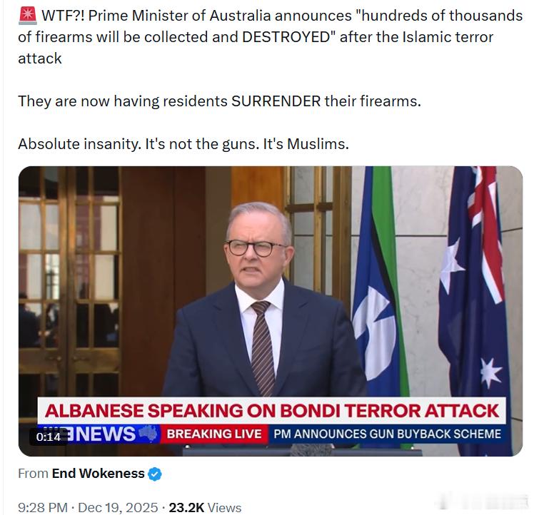 澳大利亚总理宣布,在伊斯兰恐布袭击之后,“数十万支枪支将被收缴并销毁”。他们要求居民主动上缴枪支。问题不在于枪,而在于穆斯林。