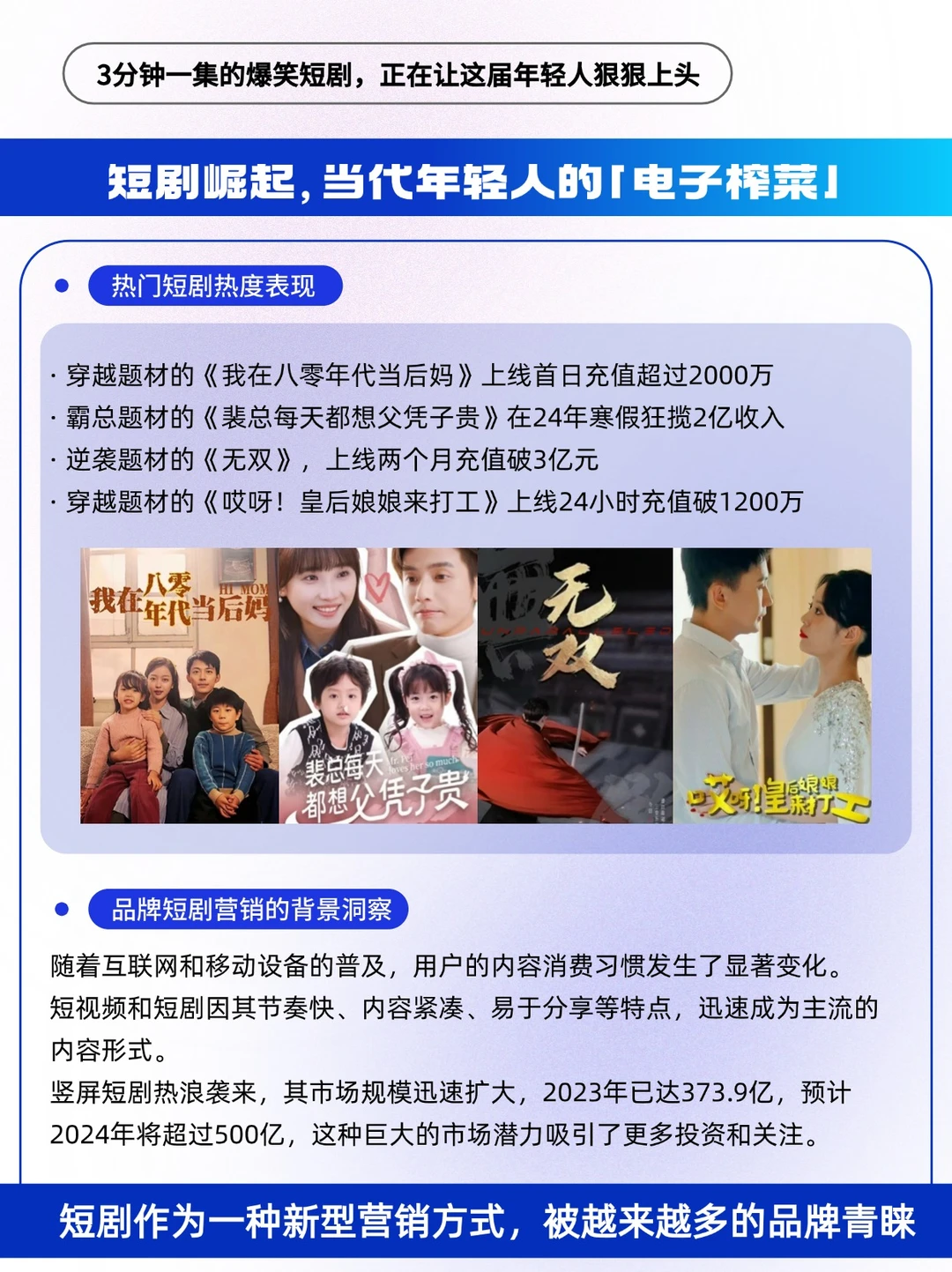 卷口碑,卷产品,卷内容,如何在瞬息万变的营销场上,迅速抓住用户眼球,一直是各大品牌思考的问题。短剧营销,给品牌们指出了一种可能性答案。